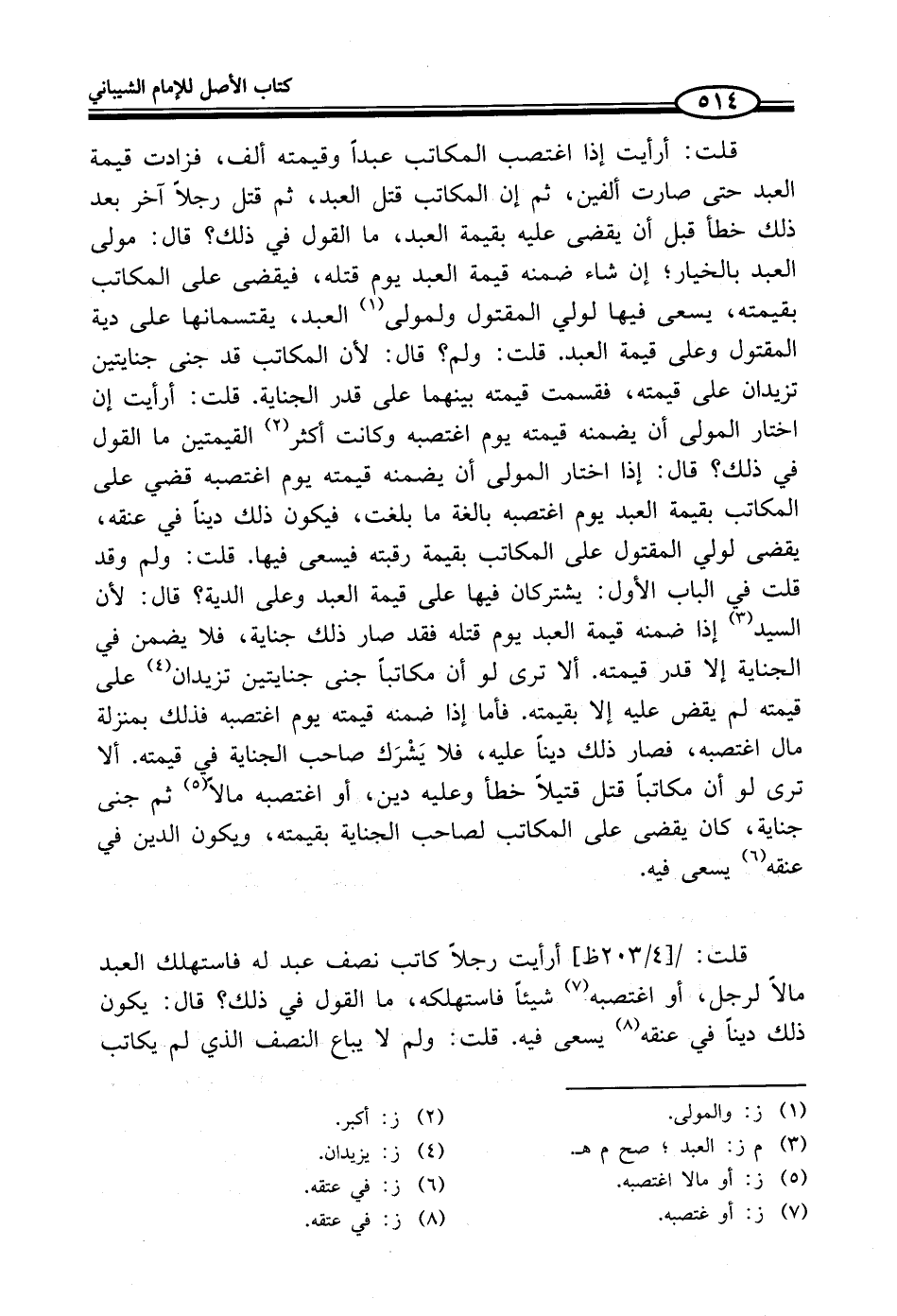 قلت: أرأيت إذا اغتصب المكاتب عبداً وقيمته ألف، فزادت قيمة العبد حتى صارت ألفين، ثم إن المكاتب قتل العبد، ثم قتل رجلاً آخر بعد ذلك خطأ قبل أن يقضى عليه بقيمة العبد، ما القول في ذلك؟ قال: مولى العبد بالخيار؛ إن شاء ضمنه قيمة العبد يوم قتله، فيقضى على المكاتب بقيمته، يسعى فيها لولي المقتول ولمولى (¬1) العبد، يقتسمانها على دية المقتول وعلى قيمة العبد. قلت: ولم؟ قال: لأن المكاتب قد جنى جنايتين تزيدان على قيمته، فقسمت قيمته بينهما على قدر الجناية. قلت: أرأيت إن اختار المولى أن يضمنه قيمته يوم اغتصبه وكانت أكثر (¬2) القيمتين ما القول في ذلك؟ قال: إذا اختار المولى أن يضمنه قيمته يوم اغتصبه قضي على المكاتب بقيمة العبد يوم اغتصبه بالغة ما بلغت، فيكون ذلك ديناً في عنقه، يقضى لولي المقتول على المكاتب بقيمة رقبته فيسعى فيها. قلت: ولم وقد قلت في الباب الأول: يشتركان فيها على قيمة العبد وعلى الدية؟ قال: لأن السيد (¬3) إذا ضمنه قيمة العبد يوم قتله فقد صار ذلك جناية، فلا يضمن في الجناية إلا قدر قيمته. ألا ترى لو أن مكاتباً جنى جنايتين تزيدان (¬4) على قيمته لم يقض عليه إلا بقيمته. فأما إذا ضمنه قيمته يوم اغتصبه فذلك بمنزلة مال اغتصبه، فصار ذلك ديناً عليه، فلا يَشْرَك صاجما الجناية في قيمته. ألا ترى لو أن مكاتباً قتل قتيلاً خطأ وعليه دين، أو اغتصبه مالاً (¬5) ثم جنى جناية، كان يقضى على المكاتب لصاحب الجناية بقيمته، ويكون الدين في عنقه (¬6) يسعى فيه.
