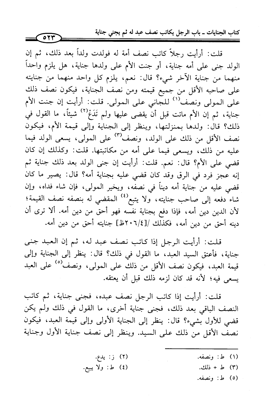 قلت: أرأيت الرجل إذا كاتب نصف عبد له، ثم إن العبد جنى جناية، فأعتق السيد العبد، ما القول في ذلك؟ قال: ينظر إلى الجناية وإلى قيمة العبد، فيكون نصف الأقل من ذلك على المولى، ونصف (¬5) على العبد يسعى فيه؛ لأنه قد كان لزمه ذلك قبل أن يعتقه.