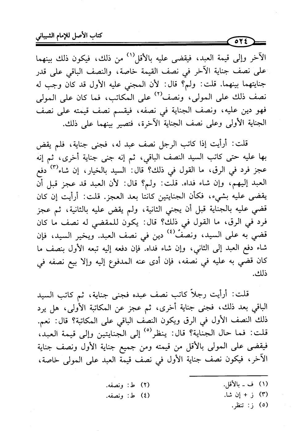 قلت: أرأيت إذا كاتب الرجل نصف عبد له، فجنى جناية، فلم يقض بها عليه حتى كاتب السيد النصف الباقي، ثم إنه جنى جناية أخرى، ثم إنه عجز فرد في الرق، ما القول في ذلك؟ قال: السيد بالخيار، إن شاء (¬3) دفع العبد إليهم، وإن شاء فداه. قلت: ولم؟ قال: لأن العبد قد عجز قبل أن يقضى عليه بشيء، فكأن الجنايتين كانتا بعد العجز. قلت: أرأيت إن كان قضي عليه بالجناية قبل أن يجني الثانية، ولم يقض عليه بالثانية، ثم عجز فرد في الرق، ما القول في ذلك؟ قال: يكون للمقضي له نصف ما كان قضي به على السيد، ونصفٌ (¬4) دين في نصف العبد. ويخير السيد، فإن شاء دفع العبد إلى الثاني، وإن شاء فداه. فإن دفعه إليه تبعه الأول بنصف ما كان قضي به عليه في نصفه، فإن أدى عنه المدفوع إليه وإلا بيع نصفه في ذلك.