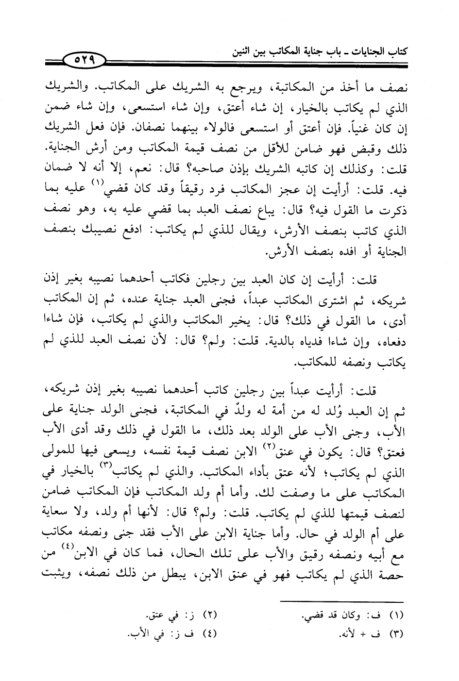 قلت: أرأيت إن كان العبد بين رجلين فكاتب أحدهما نصيبه بغير إذن شريكه، ثم اشترى المكاتب عبداً، فجنى العبد جناية عنده، ثم إن المكاتب أدى، ما القول في ذلك؟ قال: يخير المكاتب والذي لم يكاتب، فإن شاءا دفعاه، وإن شاءا فدياه بالدية. قلت: ولم؟ قال: لأن نصف العبد للذي لم يكاتب ونصفه للمكاتب.