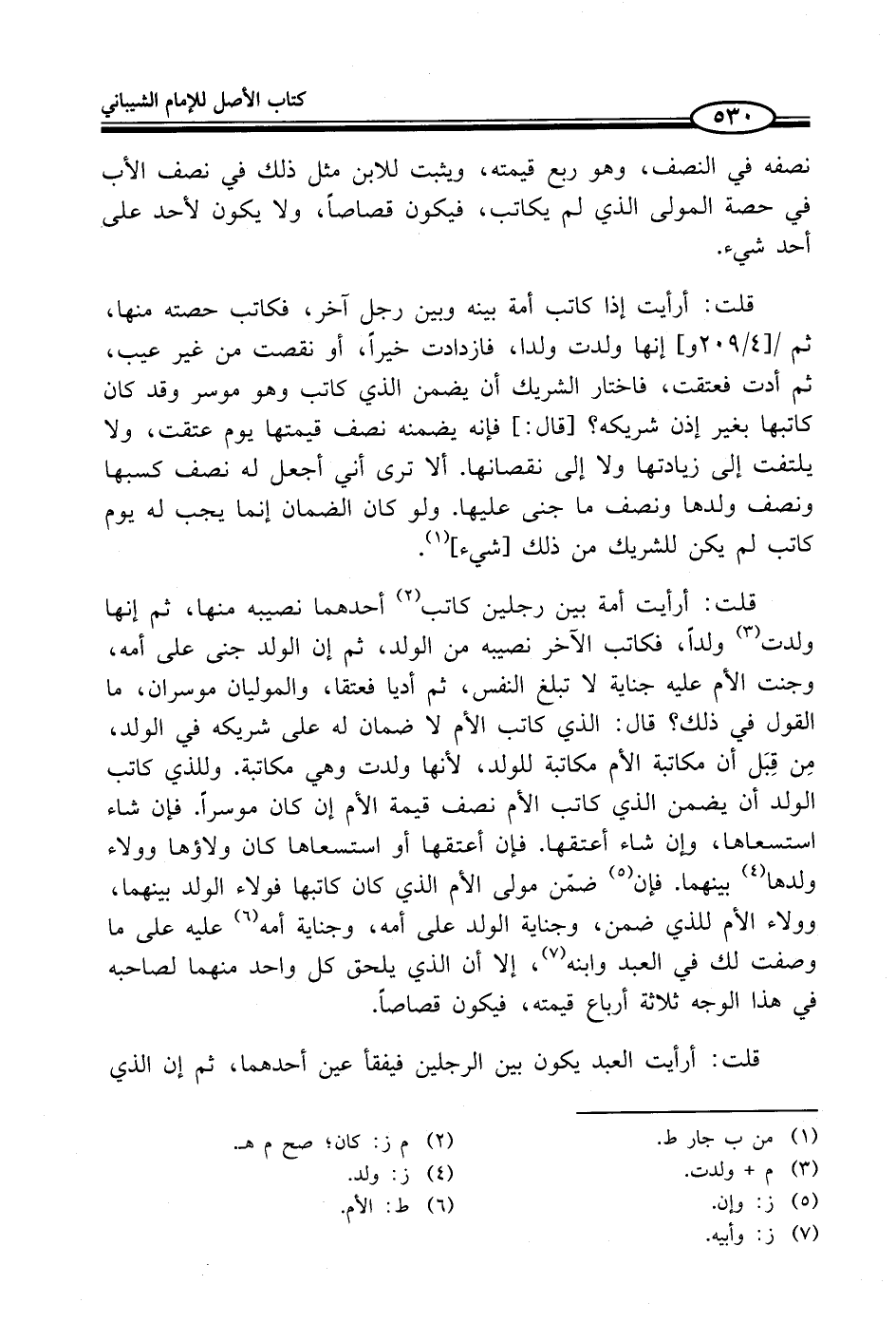 قلت: أرأيت أمة بين رجلين كاتب (¬2) أحدهما نصيبه منها، ثم إنها ولدت (¬3) ولداً، فكاتب الآخر نصيبه من الولد، ثم إن الولد جنى على أمه، وجنت الأم عليه جناية لا تبلغ النفس، ثم أديا فعتقا، والموليان موسران، ما القول في ذلك؟ قال: الذي كاتب الأم لا ضمان له على شريكه في الولد، مِن قِبَل أن مكاتبة الأم مكاتبة للولد، لأنها ولدت وهي مكاتبة. وللذي كاتب الولد أن يضمن الذي كاتب الأم نصف قيمة الأم إن كان موسراً. فإن شاء استسعاها، وإن شاء أعتقها. فإن أعتقها أو استسعاها كان ولاؤها وولاء ولدها (¬4) بينهما. فإن (¬5) ضمّن مولى الأم الذي كان كاتبها فولاء الولد بينهما، وولاء الأم للذي ضمن، وجناية الولد على أمه، وجناية أمه (¬6) عليه على ما وصفت لك في العبد وابنه (¬7)، إلا أن الذي يلحق كل واحد منهما لصاحبه في هذا الوجه ثلاثة أرباع قيمته، فيكون قصاصاً.