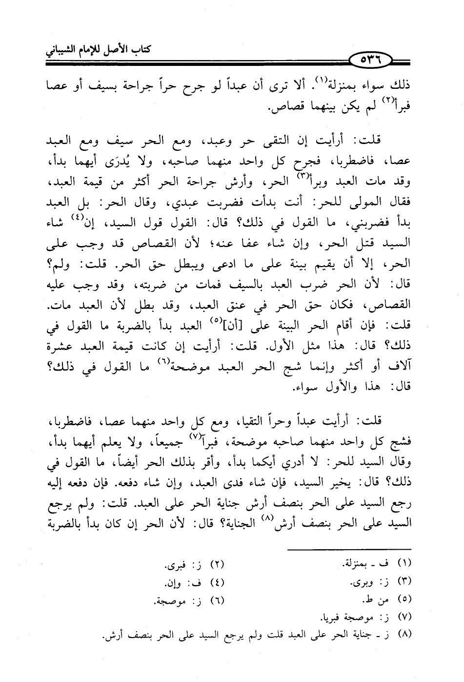 قلت: أرأيت إن التقى حر وعبد، ومع الحر سيف ومع العبد عصا، فاضطربا، فجرح كل واحد منهما صاحبه، ولا يُدرَى أيهما بدأ، وقد مات العبد وبرأ (¬3) الحر، وأرش جراحة الحر أكثر من قيمة العبد، فقال المولى للحر: أنت بدأت فضربت عبدي، وقال الحر: بل العبد بدأ فضربني، ما القول في ذلك؟ قال: القول قول السيد، إن (¬4) شاء السيد قتل الحر، وإن شاء عفا عنه؛ لأن القصاص قد وجب على الحر، إلا أن يقيم بينة على ما ادعى ويبطل حق الحر. قلت: ولم؟ قال: لأن الحر ضرب العبد بالسيف فمات من ضربته، وقد وجب عليه القصاص، فكان حق الحر في عنق العبد، وقد بطل لأن العبد مات. قلت: فإن أقام الحر البينة على [أن] (¬5) العبد بدأ بالضربة ما القول في ذلك؟ قال: هذا مثل الأول. قلت: أرأيت إن كانت قيمة العبد عشرة آلاف أو أكثر وإنما شج الحر العبد موضحة (¬6) ما القول في ذلك؟ قال: هذا والأول سواء.