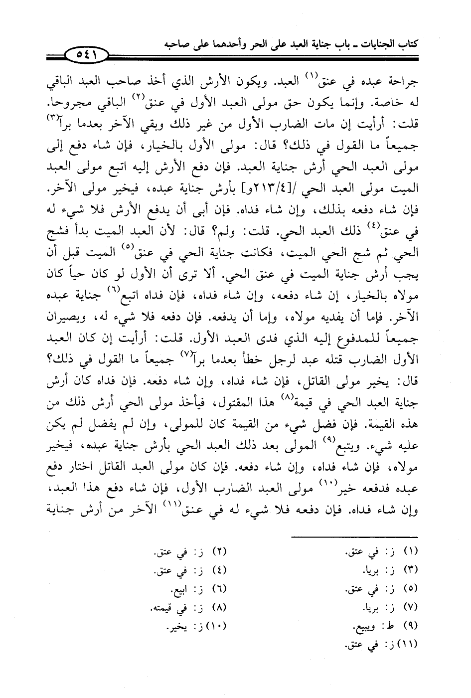 جراحة عبده في عنق (¬1) العبد. ويكون الأرش الذي أخذ صاحب العبد الباقي له خاصة. وإنما يكون حق مولى العبد الأول في عنق (¬2) الباقي مجروحا. قلت: أرأيت إن مات الضارب الأول من غير ذلك وبقي الآخر بعدما برآ (¬3) جميعاً ما القول في ذلك؟ قال: مولى الأول بالخيار، فإن شاء دفع إلى مولى العبد الحي أرش جناية العبد. فإن دفع الأرش إليه اتبع مولى العبد الميت مولى العبد الحي بأرش جناية عبده، فيخير مولى الآخر. فإن شاء دفعه بذلك، وإن شاء فداه. فإن أبى أن يدفع الأرش فلا شيء له في عنق (¬4) ذلك العبد الحي. قلت: ولم؟ قال: لأن العبد الميت بدأ فشج الحي ثم شج الحي الميت، فكانت جناية الحي في عنق (¬5) الميت قبل أن يجب أرش جناية الميت في عنق الحي. ألا ترى أن الأول لو كان حياً كان مولاه بالخيار، إن شاء دفعه، وإن شاء فداه، فإن فداه اتبع (¬6) جناية عبده الآخر. فإما أن يفديه مولاه، واما أن يدفعه. فإن دفعه فلا شيء له، ويصيران جميعاً للمدفوع إليه الذي فدى العبد الأول. قلت: أرأيت إن كان العبد الأول الضارب قتله عبد لرجل خطأ بعدما برآ (¬7) جميعاً ما القول في ذلك؟ قال: يخير مولى القاتل، فإن شاء فداه، وإن شاء دفعه. فإن فداه كان آرش جناية العبد الحي في قيمة (¬8) هذا المقتول، فيأخذ مولى الحي أرش ذلك من هذه القيمة. فإن فضل شيء من القيمة كان للمولى، وإن لم يفضل لم يكن عليه شيء. ويتبع (¬9) المولى بعد ذلك العبد الحي بأرش جناية عبده، فيخير مولاه، فإن شاء فداه، وإن شاء دفعه. فإن كان مولى العبد القاتل اختار دفع عبده فدفعه خير (¬10) مولى العبد الضارب الأول، فإن شاء دفع هذا العبد، وإن شاء فداه. فإن دفعه فلا شيء له في عنق (¬11) الآخر من أرش جناية