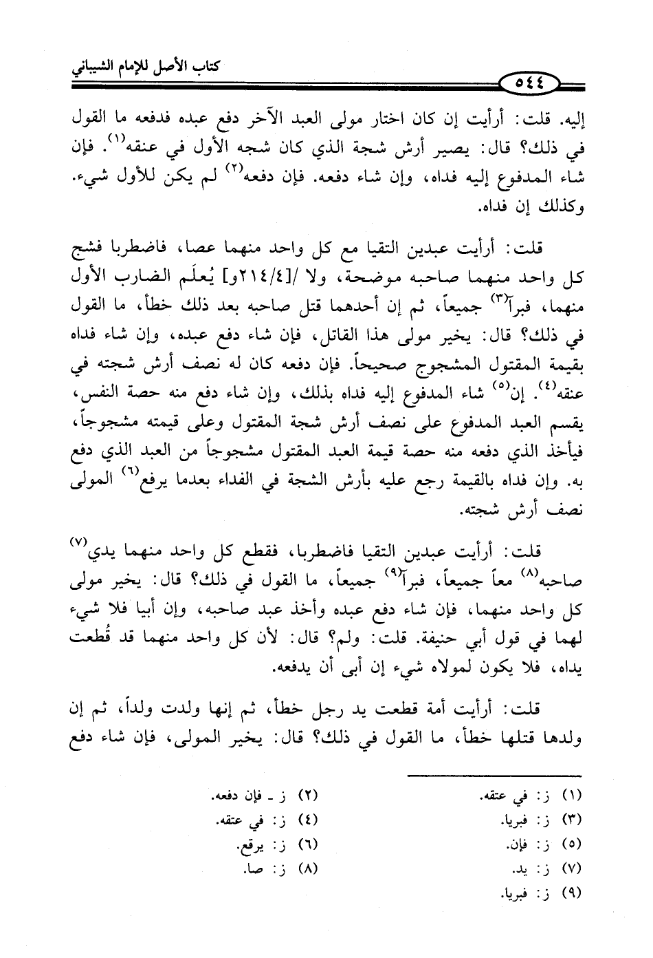 قلت: أرأيت عبدين التقيا مع كل واحد منهما عصا، فاضطربا فشج كل واحد منهما صاحبه موضحة، ولا يُعلَم الضارب الأول منهما، فبرآ (¬3) جميعاً، ثم إن أحدهما قتل صاحبه بعد ذلك خطأ، ما القول في ذلك؟ قال: يخير مولى هذا القاتل، فإن شاء دفع عبده، وإن شاء فداه بقيمة المقتول المشجوج صحيحاً. فإن دفعه كان له نصف أرش شجته في عنقه (¬4). إن (¬5) شاء المدفوع إليه فداه بذلك، وإن شاء دفع منه حصة النفس، يقسم العبد المدفوع على نصف أرش شجة المقتول وعلى قيمته مشجوجاً، فيأخذ الذي دفعه منه حصة قيمة العبد المقتول مشجوجاً من العبد الذي دفع به. وإن فداه بالقيمة رجع عليه بأرش الشجة في الفداء بعدما يرفع (¬6) المولى نصف أرش شجته.