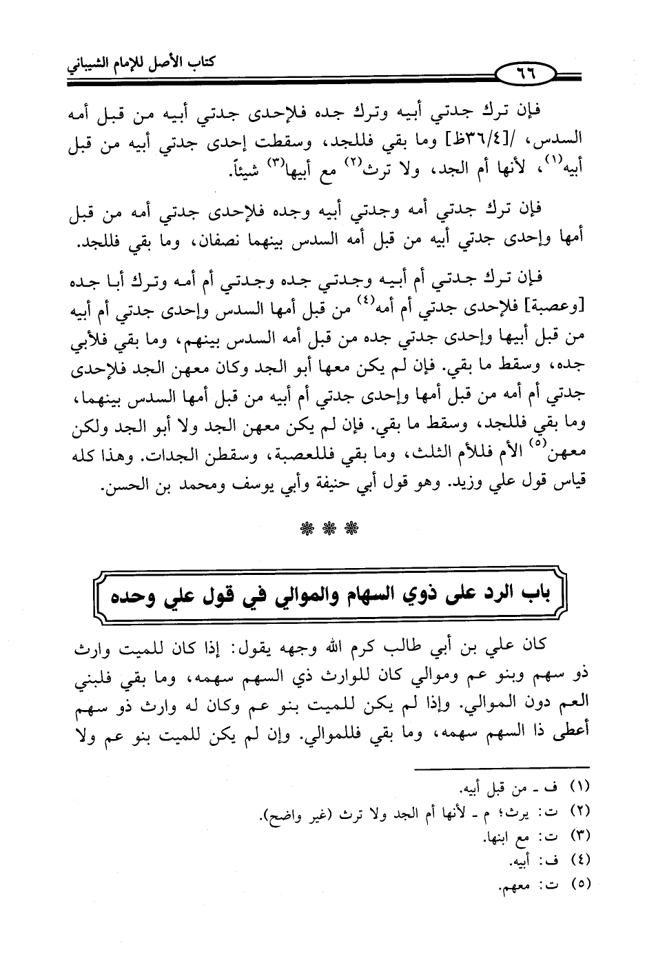 كان علي بن أبي طالب كرم الله وجهه يقول: إذا كان للميت وارث ذو سهم وبنو عم وموالي كان للوارث ذي السهم سهمه، وما بقي فلبني العم دون الموالي. وإذا لم يكن للميت بنو عم وكان له وارث ذو سهم أعطى ذا السهم سهمه، وما بقي فللموالي. وإن لم يكن للميت بنو عم ولا