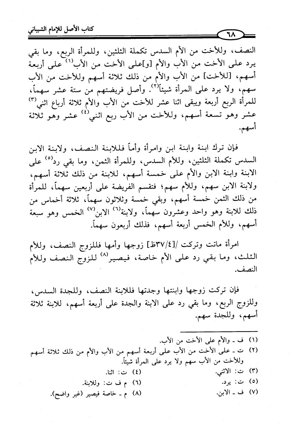 (¬2) ت - على الأخت من الأب على أربعة أسهم من الأب والأم من ذلك ثلاثة أسهم وللأخت من الأب سهم ولا يرد على المرأة شيئاً.