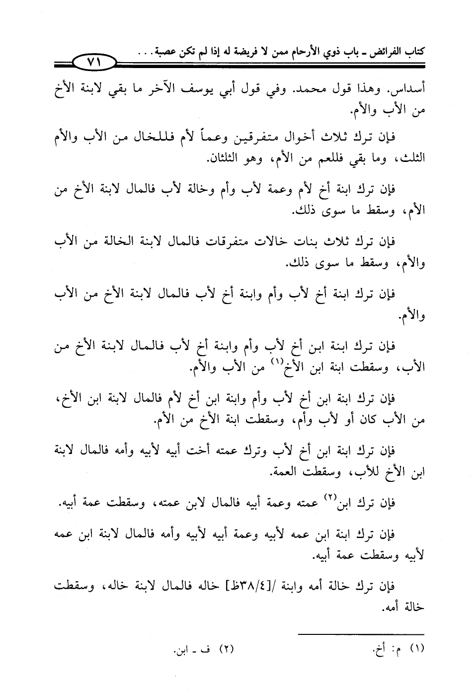 فإن ترك ابنة ابن ابنة ابن وأم وابنة ابن أخ لأم فالمال لابنة ابن الأخ، من الأب كان أو لأب وأم، وسقطت ابنة الأخ من الأم.