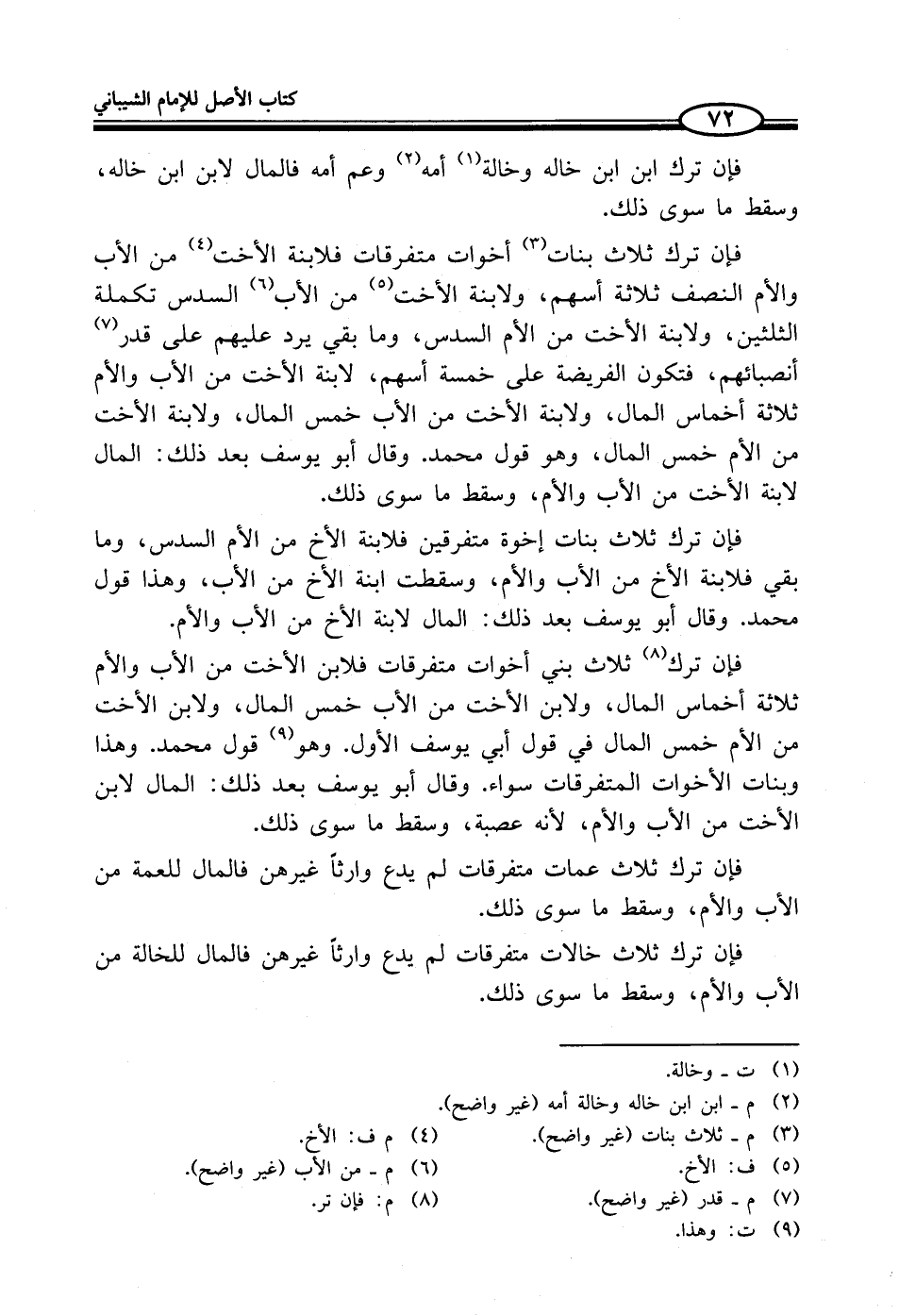 فإن ترك (¬8) ثلاث بني أخوات متفرقات فلابن الأخت من الأب والأم ثلاثة أخماس المال، ولابن الأخت من الأب خمس المال، ولابن الأخت من الأم خمس المال في قول أبي يوسف الأول. وهو (¬9) قول محمد. وهذا وبنات الأخوات المتفرقات سواء. وقال أَبو يوسف بعد ذلك: المال لابن الأخت من الأب والأم، لأنه عصبة، وسقط ما سوى ذلك.