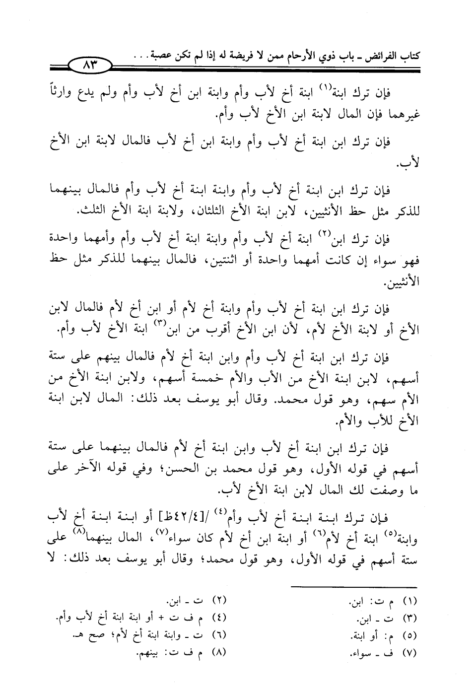 فإن ترك ابنة ابنة أخ لأب وأم (¬4) أو ابنة ابنة أخ لأب وابنة (¬5) ابنة أخ لأم (¬6) أو ابنة ابن أخ لأم كان سواء (¬7)، المال بينهما (¬8) على ستة أسهم في قوله الأول، وهو قول محمد؛ وقال أبو يوسف بعد ذلك: لا