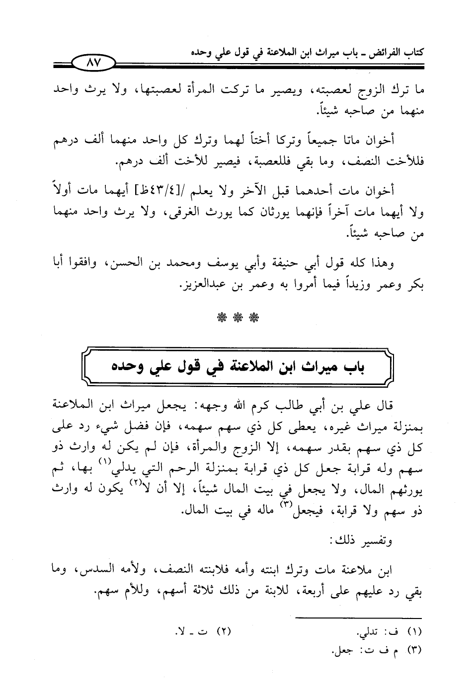 قال علي بن أبي طالب كرم الله وجهه: يجعل ميراث ابن الملاعنة بمنزلة ميراث غيره، يعطى كل ذي سهم سهمه، فإن فضل شيء رد على كل ذي سهم بقدر سهمه، إلا الزوج والمرأة، فإن لم يكن له وارث ذو سهم وله قرابة جعل كل ذي قرابة بمنزلة الرحم التي يدلي (¬1) بها، ثم يورثهم المال، ولا يجعل في بيت المال شيئاً، إلا أن لا (¬2) يكون له وارث ذو سهم ولا قرابة، فيجعل (¬3) ماله في بيت المال.