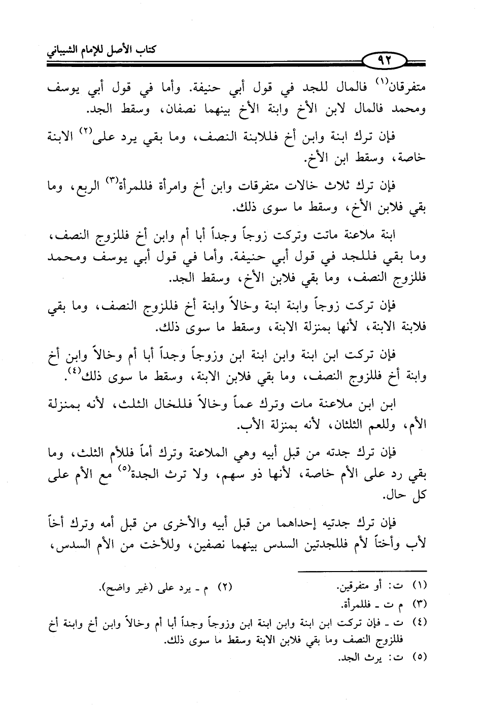 (¬4) ت - فإن تركت ابن ابنة وابن ابنة ابن وزوجاً وجداً أبا أم وخالاً وابن أخ وابنة أخ فللزوج النصف وما بقي فلابن الابنة وسقط ما سوى ذلك.