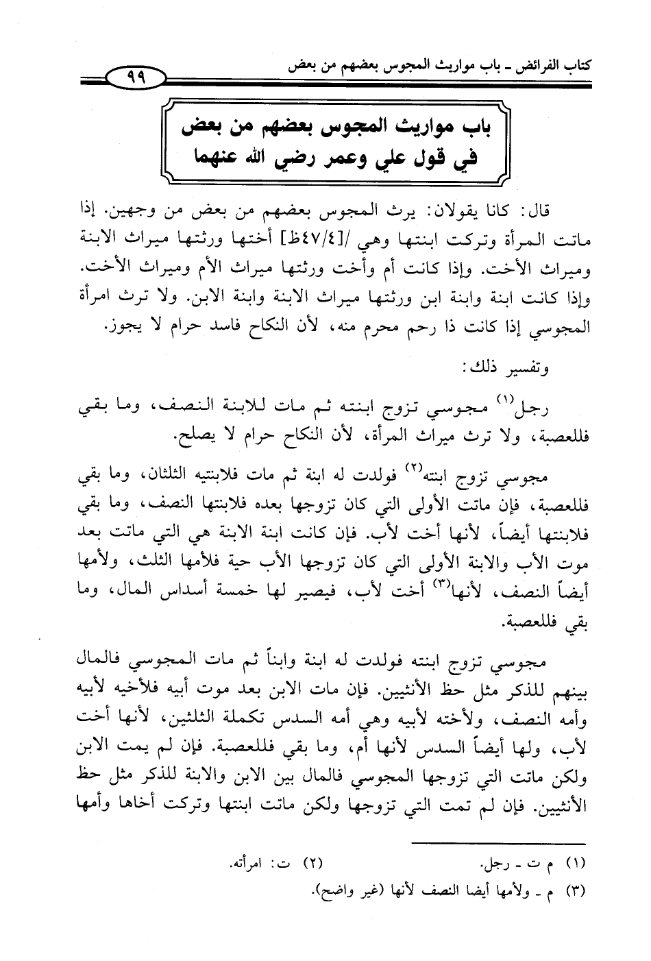 قال: كانا يقولان: يرث المجوس بعضهم من بعض من وجهين. إذا ماتت المرأة وتركت ابنتها وهي أختها ورثتها ميراث الابنة وميراث الأخت. وإذا كانت أم وأخت ورثتها ميراث الأم وميراث الأخت. وإذا كانت ابنة وابنة ابن ورثتها ميراث الابنة وابنة الابن. ولا ترث امرأة المجوسي إذا كانت ذا رحم محرم منه، لأن النكاح فاسد حرام لا يجوز.