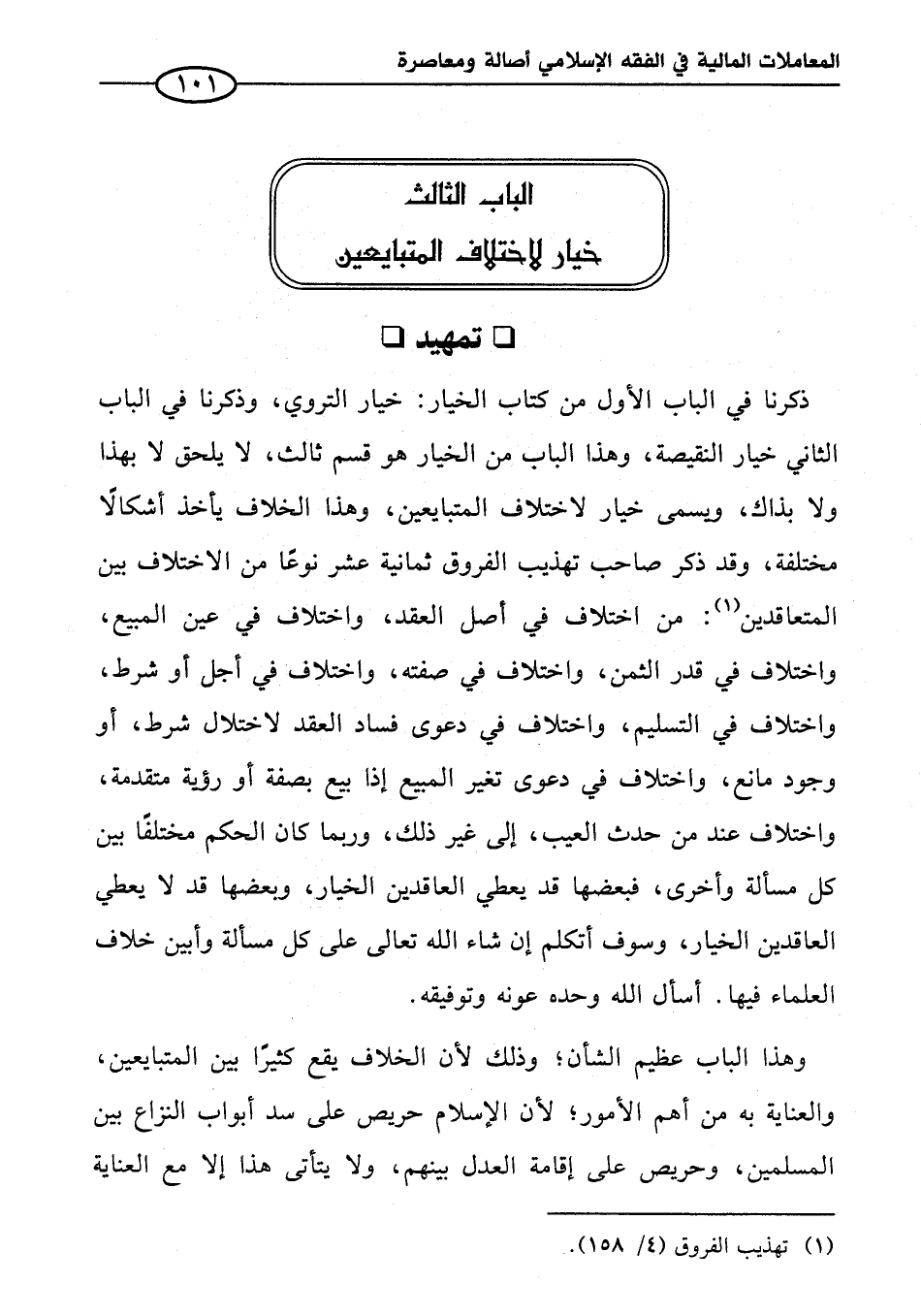 ذكرنا في الباب الأول من كتاب الخيار: خيار التروي، وذكرنا في الباب الثاني خيار النقيصة، وهذا الباب من الخيار هو قسم ثالث، لا يلحق لا بهذا ولا بذاك، ويسمى خيار لاختلاف المتبايعين، وهذا الخلاف يأخذ أشكالًا مختلفة، وقد ذكر صاحب تهذيب الفروق ثمانية عشر نوعًا من الاختلاف بين المتعاقدين (¬١): من اختلاف في أصل العقد، واختلاف في عين المبيع، واختلاف في قدر الثمن، واختلاف في صفته، واختلاف في أجل أو شرط، واختلاف في التسليم، واختلاف في دعوى فساد العقد لاختلال شرط، أو وجود مانع، واختلاف في دعوى تغير المبيع إذا بيع بصفة أو رؤية متقدمة، واختلاف عند من حدث العيب، إلى غير ذلك، وربما كان الحكم مختلفًا بين كل مسألة وأخرى، فبعضها قد يعطي العاقدين الخيار، وبعضها قد لا يعطي العاقدين الخيار، وسوف أتكلم إن شاء الله تعالى على كل مسألة وأبين خلاف العلماء فيها. أسأل الله وحده عونه وتوفيقه.