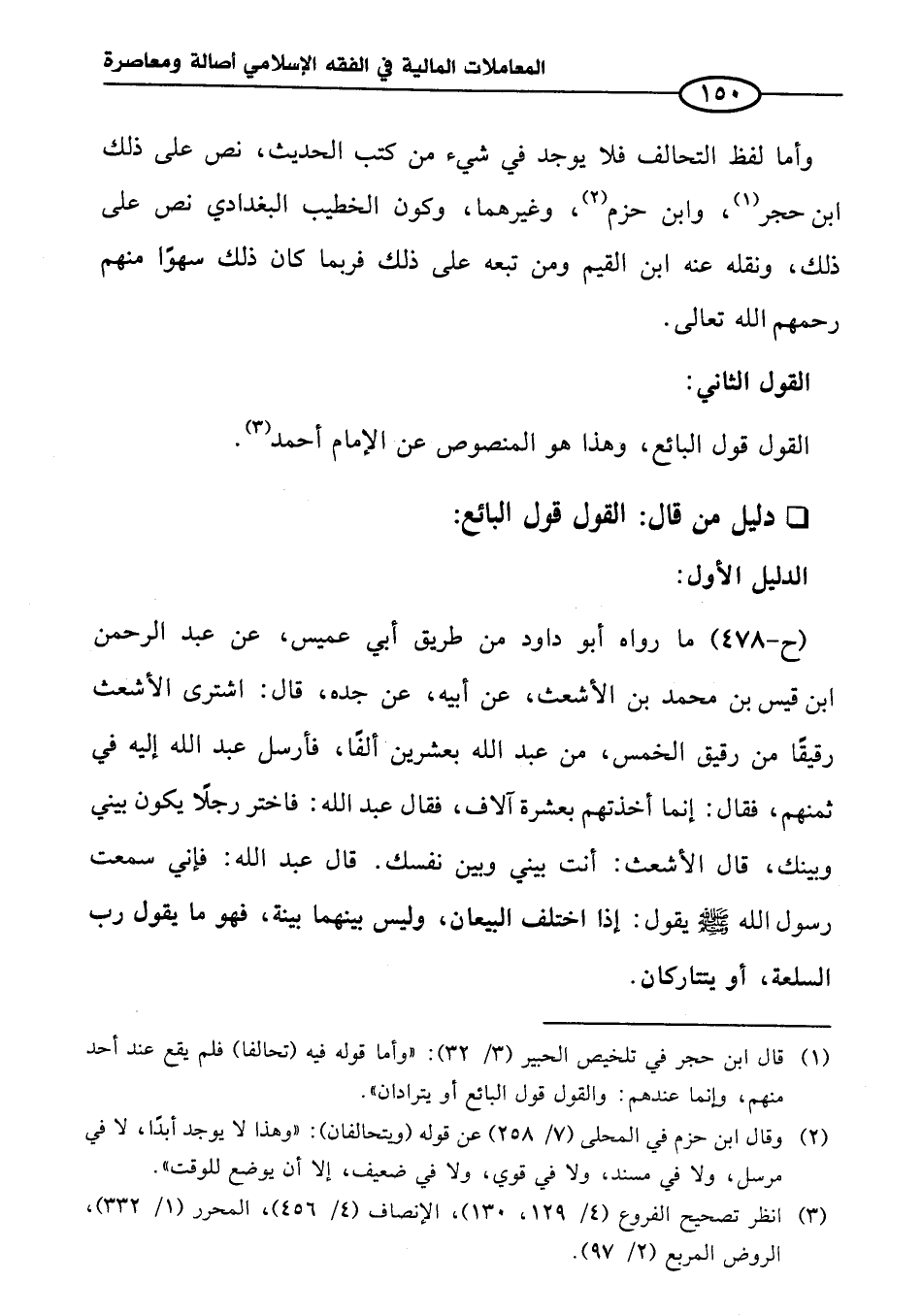 (¬٢) وقال ابن حزم في المحلى (٧/ ٢٥٨) عن قوله (ويتحالفان): "وهذا لا يوجد أبدًا، لا في مرسل، ولا في مسند، ولا في قوي، ولا في ضعيف، إلا أن يوضع للوقت".
