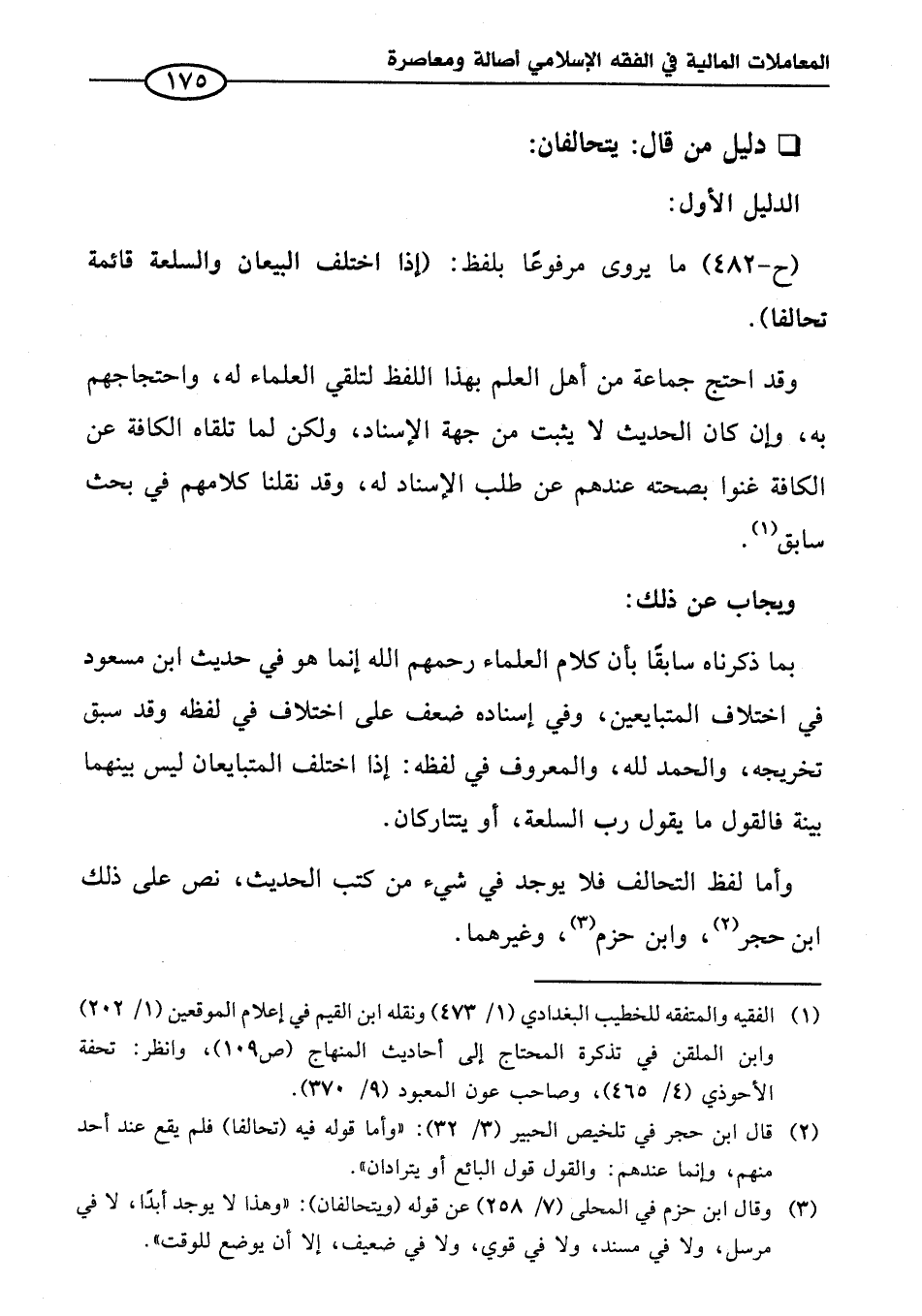 (¬٣) وقال ابن حزم في المحلى (٧/ ٢٥٨) عن قوله (ويتحالفان): "وهذا لا يوجد أبدًا، لا في مرسل، ولا في مسند، ولا في قوي، ولا في ضعيف، إلا أن يوضع للوقت".