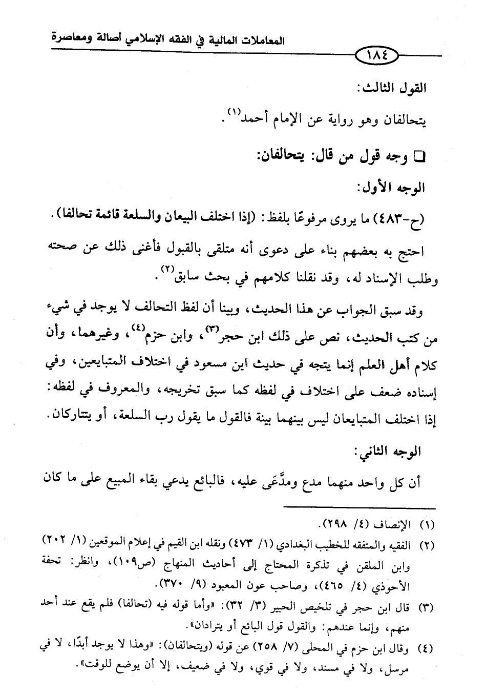 (¬٤) وقال ابن حزم في المحلى (٧/ ٢٥٨) عن قوله (ويتحالفان): "وهذا لا يوجد أبدًا، لا في مرسل، ولا في مسند، ولا في قوي، ولا في ضعيف، إلا أن يوضع للوقت".