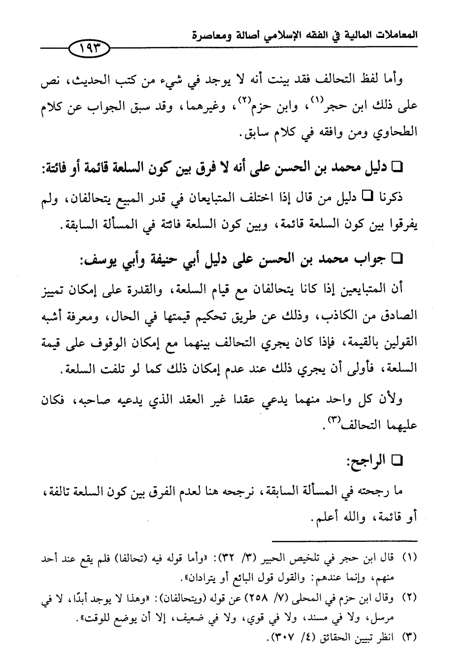 (¬٢) وقال ابن حزم في المحلى (٧/ ٢٥٨) عن قوله (ويتحالفان): "وهذا لا يوجد أبداً، لا في مرسل، ولا في مسند، ولا في قوي، ولا في ضعيف، إلا أن يوضع للوقت".