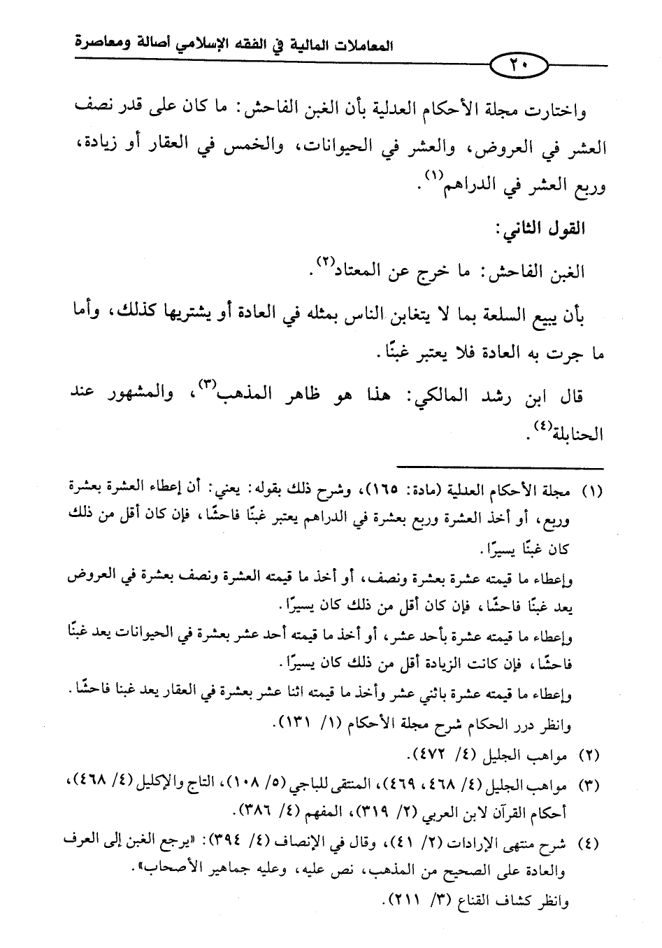 (¬١) مجلة الأحكام العدلية (مادة: ١٦٥)، وشرح ذلك بقوله: يعني: أن إعطاء العشرة بعشرة وريع، أو أخذ العشرة وربع بعشرة في الدراهم يعتبر غبنًا فاحشًا، فإن كان أقل من ذلك كان غبنًا يسيرًا.