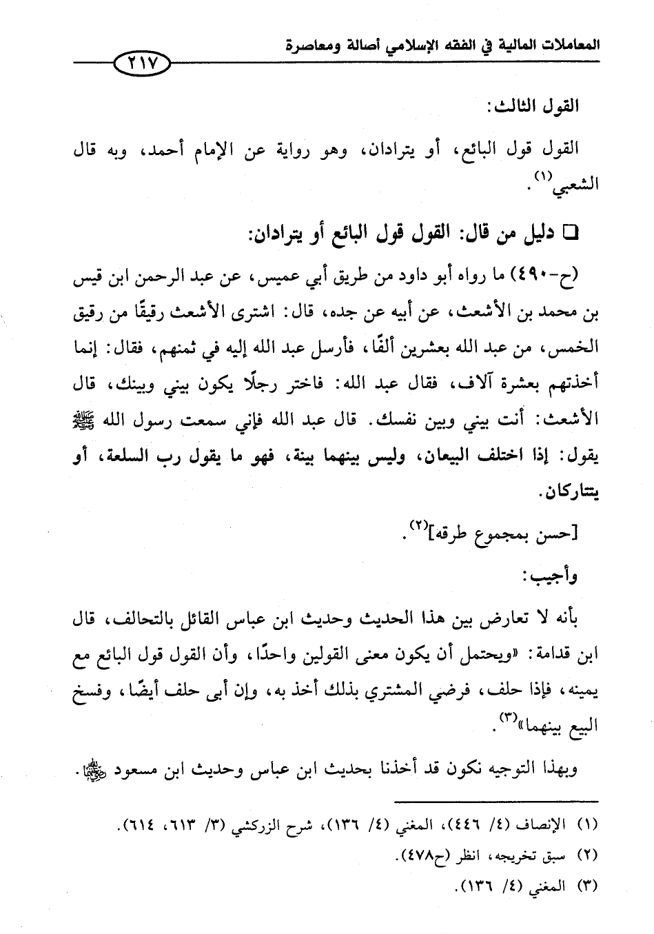 (ح-٤٩٠) ما رواه أبو داود من طريق أبي عميس، عن عبد الرحمن ابن قيس بن محمد بن الأشعث، عن أبيه عن جده، قال: اشترى الأشعث رقيقًا من رقيق الخمس، من عبد الله بعشرين ألفًا, فأرسل عبد الله إليه في ثمنهم، فقال: إنما أخذتهم بعشرة آلاف، فقال عبد الله: فاختر رجلاً يكون بيني وبينك، قال الأشعث: أنت بيني وبين نفسك. قال عبد الله فإني سمعت رسول الله -صلى الله عليه وسلم- يقول: إذا اختلف البيعان، وليس بينهما بينة، فهو ما يقول رب السلعة، أو يتتاركان.