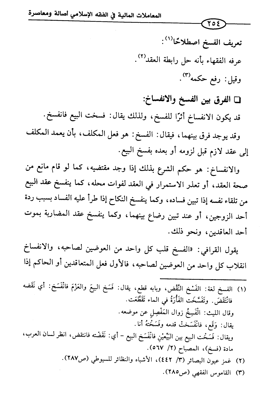 (¬١) الفسخ لغة: الفَسْخ النَّقْض، وبابه قطع، يقال: فَسَخ البيعَ والعَزْمَ فانْفَسَخ: أي نَقَضه فانْتَقَضَ. وتَفسَّخت الفَأرَةُ في الماء تَقَطَّعَت.