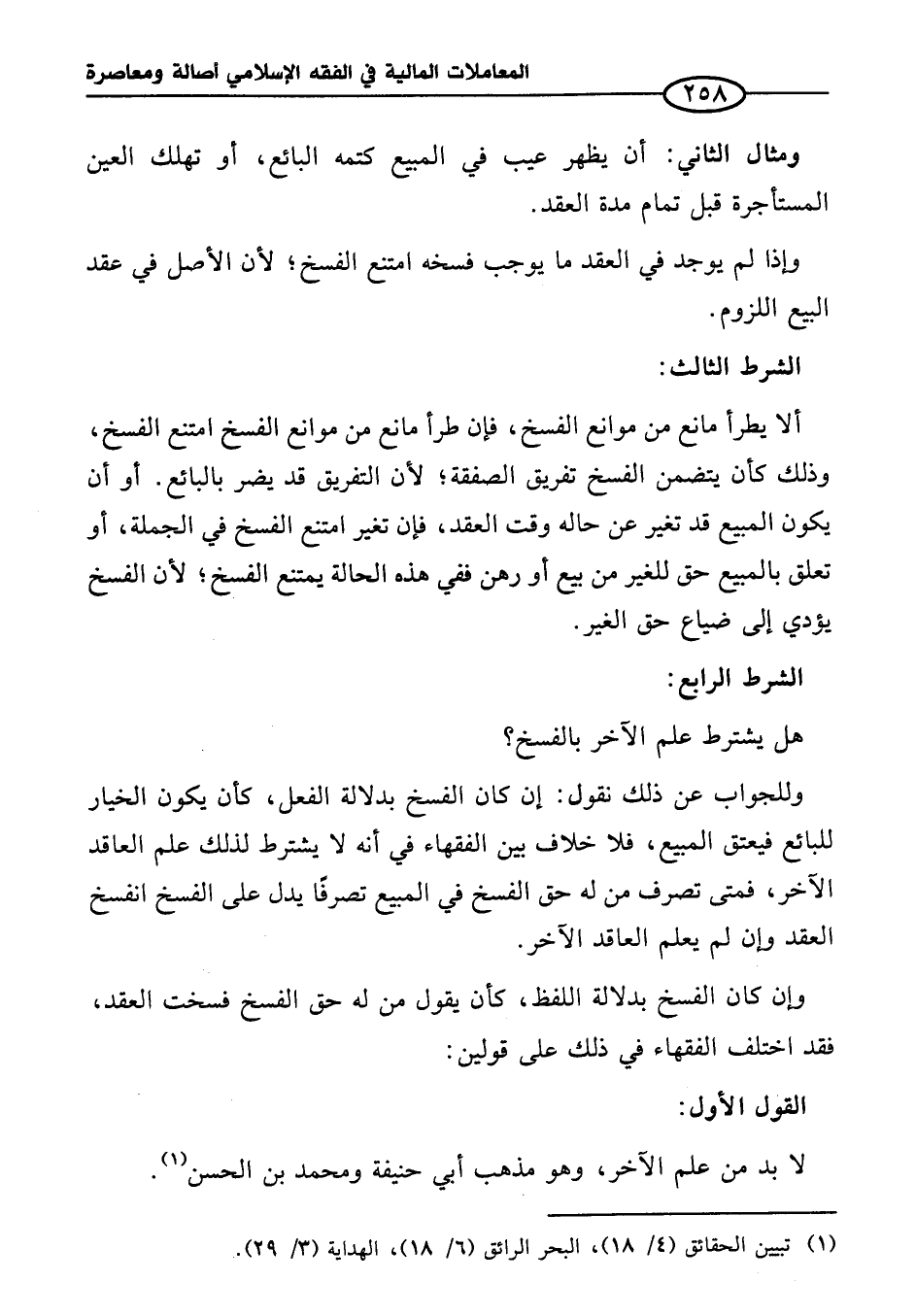 ألا يطرأ مانع من موانع الفسخ، فإن طرأ مانع من موانع الفسخ امتنع الفسخ، وذلك كأن يتضمن الفسخ تفريق الصفقة؛ لأن التفريق قد يضر بالبائع. أو أن يكون المبيع قد تغير عن حاله وقت العقد، فإن تغير امتنع الفسخ في الجملة، أو تعلق بالمبيع حق للغير من بيع أو رهن ففي هذه الحالة يمتنع الفسخ؛ لأن الفسخ يؤدي إلى ضياع حق الغير.