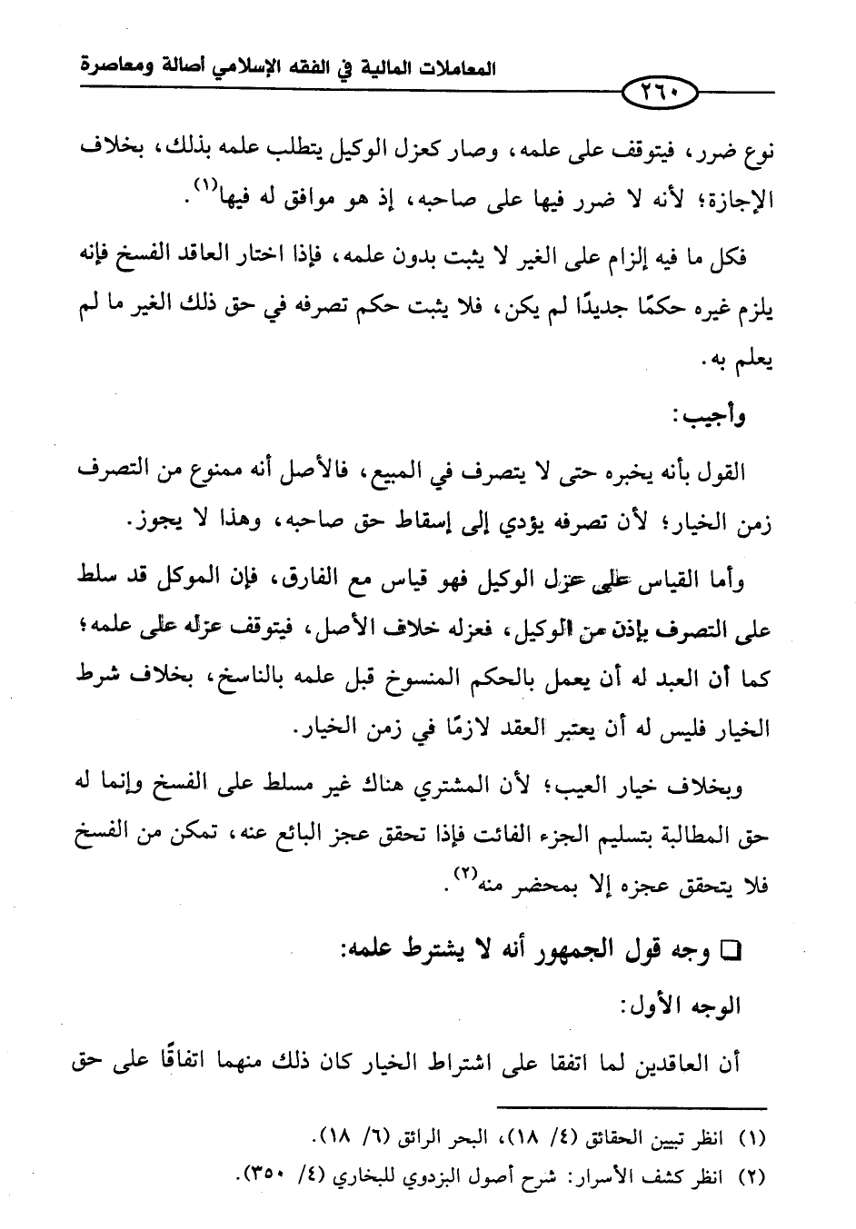 وأما القياس على عزل الوكيل فهو قياس مع الفارق، فإن الموكل قد سلط على التصرف بإذن من الوكيل، فعزله خلاف الأصل، فيتوقف عزله على علمه؛ كما أن العبد له أن يعمل بالحكم المنسوخ قبل علمه بالناسخ، بخلاف شرط الخيار فليس له أن يختبر العقد لازمًا في زمن الخيار.