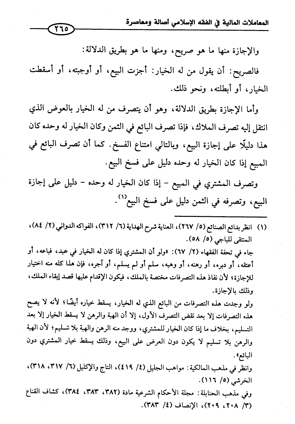 وأما الإجازة بطريق الدلالة، وهو أن يتصرف من له الخيار بالعوض الذي انتقل إليه تصرف الملاك، فإذا تصرف البائع في الثمن وكان الخيار له وحده كان هذا دليلاً على إجازة البيع، وبالتالي امتناع الفسخ. كما أن تصرف البائع في المبيع إذا كان الخيار له وحده دليل على فسخ البيع.