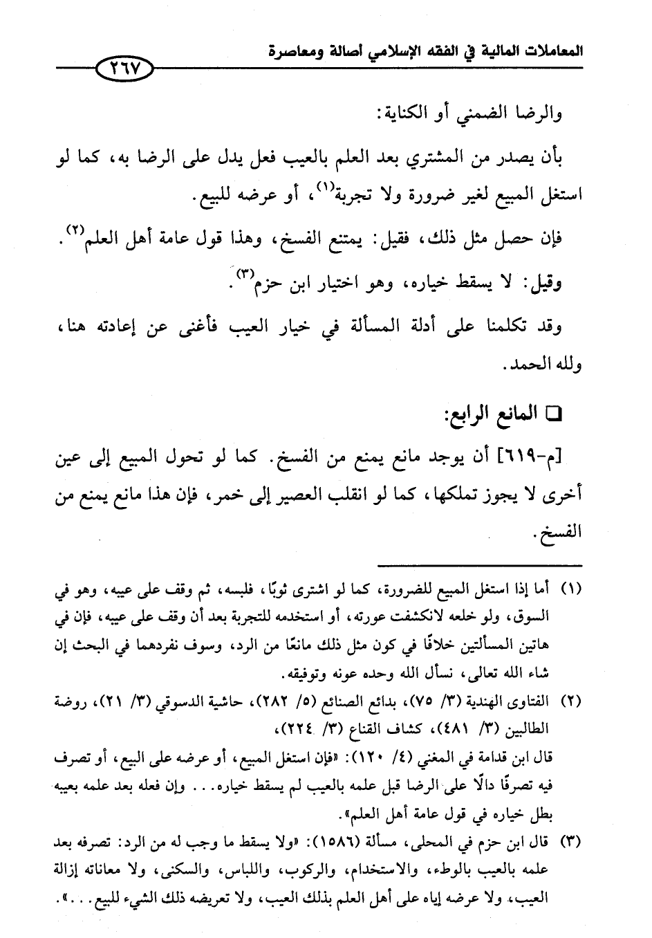 (¬٣) قال ابن حزم في المحلى، مسألة (١٥٨٦): "ولا يسقط ما وجب له من الرد: تصرفه بعد علمه بالعيب بالوطء، والاستخدام، والركوب، واللباس، والسكنى، ولا معاناته إزالة العيب, ولا عرضه إياه على أهل العلم بذلك العيب، ولا تعريضه ذلك الشيء للبيع ... ".