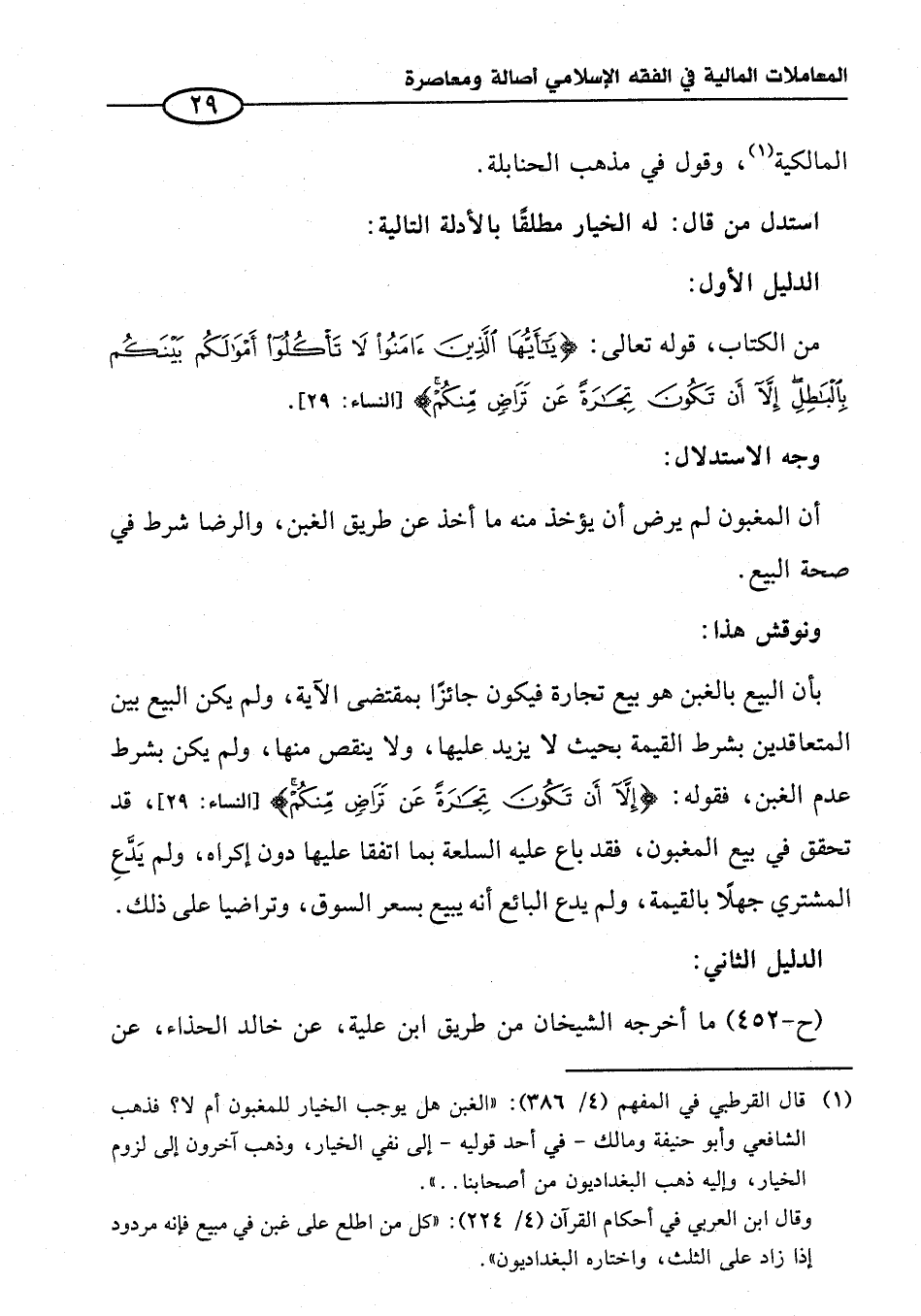 (¬١) قال القرطبي في المفهم (٤/ ٣٨٦): "الغبن هل يوجب الخيار للمغبون أم لا؟ فذهب الشافعي وأبو حنيفة ومالك - في أحد قوليه - إلى نفي الخيار، وذهب آخرون إلى لزوم الخيار، وإليه ذهب البغداديون من أصحابنا .. ".