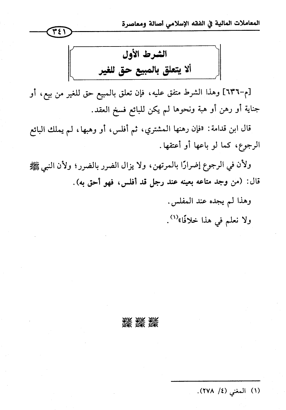 [م - ٦٣٦] وهذا الشرط متفق عليه، فإن تعلق بالمبيع حق للغير من بيع، أو جناية أو رهن أو هبة ونحوها لم يكن للبائع فسخ العقد.