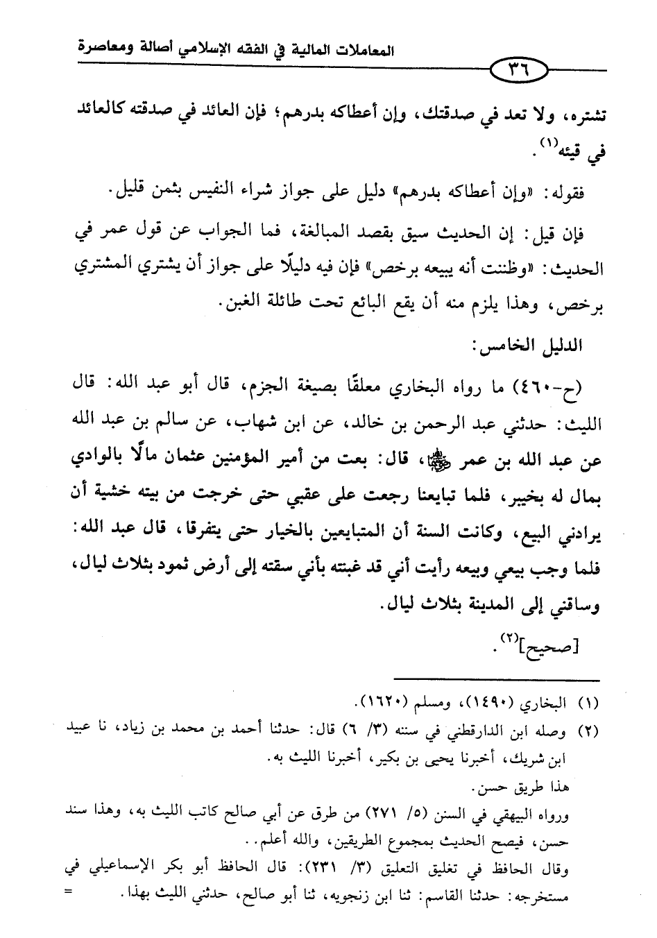 (ح-٤٦٠) ما رواه البخاري معلقًا بصيغة الجزم، قال أبو عبد الله: قال الليث: حدثني عبد الرحمن بن خالد، عن ابن شهاب، عن سالم بن عبد الله عن عبد الله بن عمر - رضي الله عنه -، قال: بعت من أمير المومنين عثمان مالاً بالوادي بمال له بخيبر، فلما تبايعنا رجعت على عقبي حتى خرجت من بيته خشية أن يرادني البيع، وكانت السنة أن المتبايعين بالخيار حتى يتفرقا، قال عبد الله: فلما وجب بيعي وبيعه رأيت أني قد غبنته بأني سقته إلى أرض ثمود بثلاث ليال، وساقني إلى المدينة بثلاث ليال.