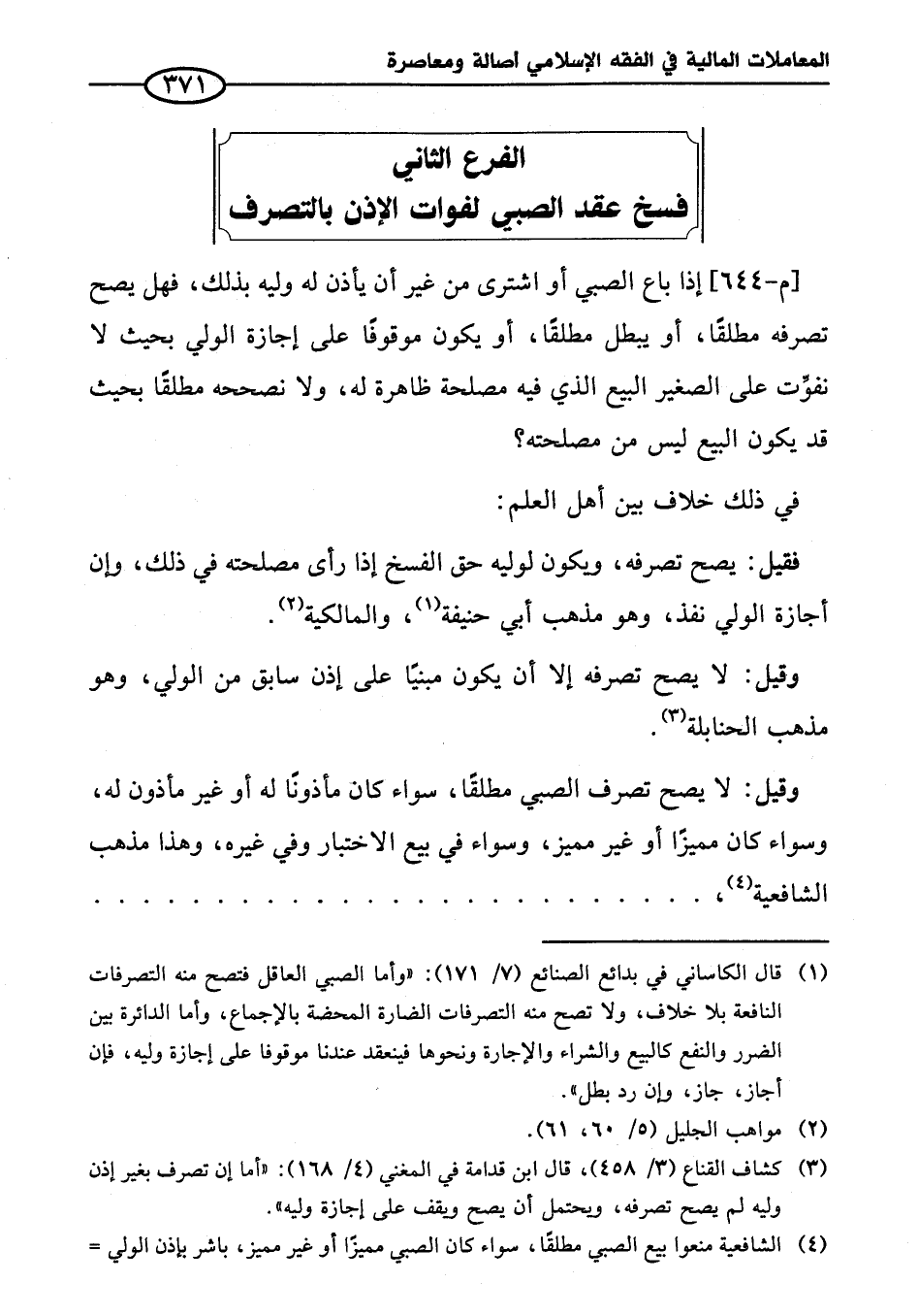 (¬٣) كشاف القناع (٣/ ٤٥٨)، قال ابن قدامة في المغني (٤/ ١٦٨): "أما إن تصرف بغير إذن وليه لم يصح تصرفه، ويحتمل أن يصح ويقف على إجازة وليه".