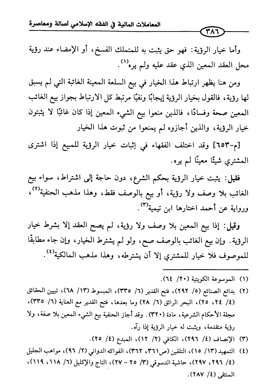 (¬٢) بدائع الصنائع (٥/ ٢٩٢)، فتح القدير (٦/ ٣٣٥)، المبسوط (١٣/ ٦٨)، تبيين الحقائق (٤/ ٢٤، ٢٥)، البحر الرائق (٦/ ٢٨) وما بعدها، فتح القدير مع العناية (٦/ ٣٣٥)، مجلة الأحكام الشرعية، مادة (٣٢٠). وقد أجاز الحنفية بيع الشيء المعين بلا صفة، ولا رؤية متقدمة، ويثبت له خيار الرؤية إذا رآه.