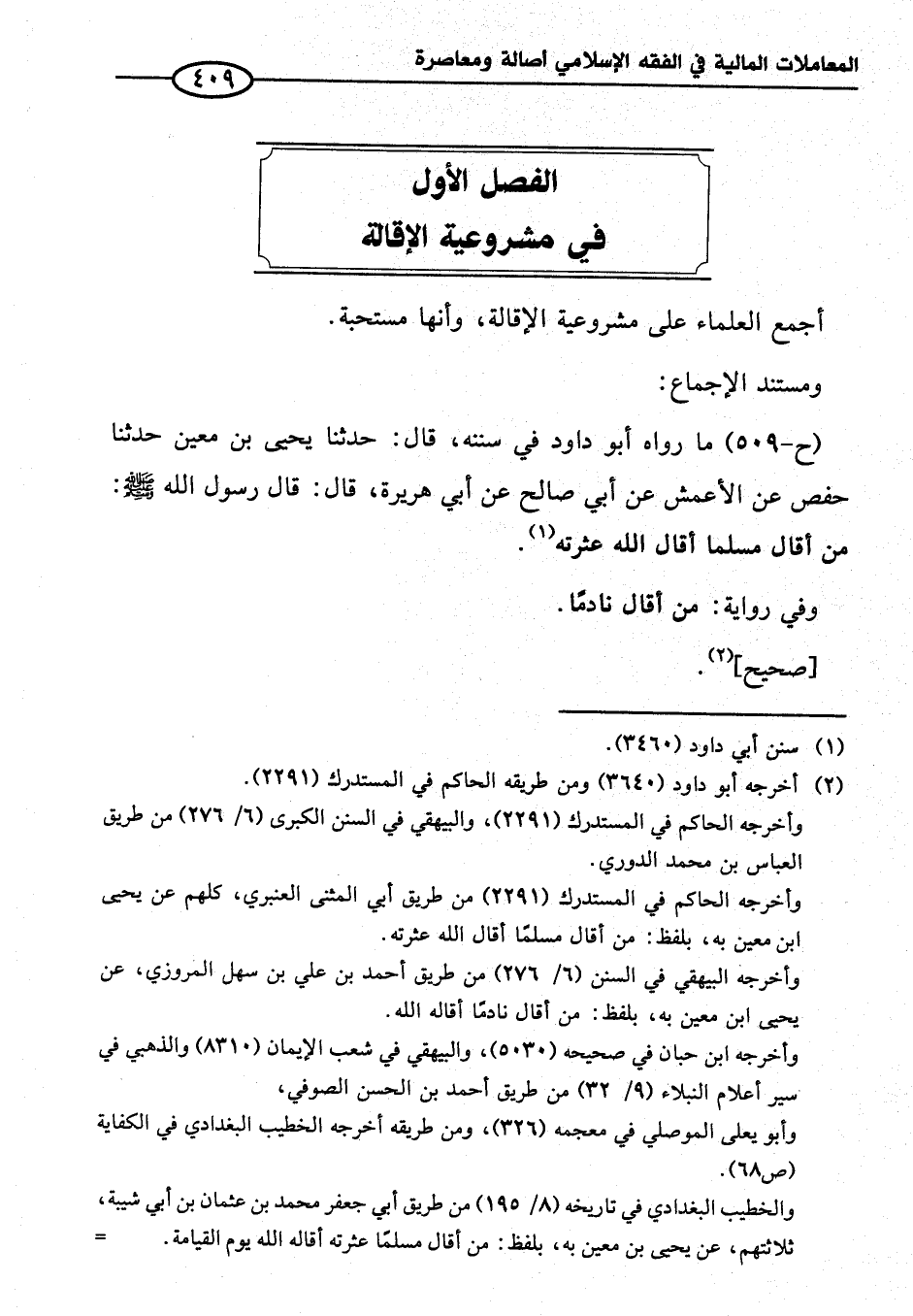 (ح-٥٠٩) ما رواه أبو داود في سننه، قال: حدثنا يحيى بن معين حدثنا حفص عن الأعمش عن أبي صالح عن أبي هريرة، قال: قال رسول الله -صلى الله عليه وسلم-: من أقال مسلما أقال الله عثرته (¬١).