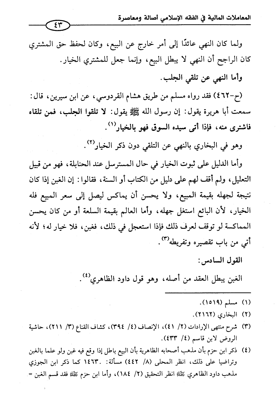 (ح-٤٦٢) فقد رواه مسلم من طريق هشام القردوسي، عن ابن سيرين، قال: سمعت أبا هريرة يقول: إن رسول الله - صلى الله عليه وسلم - يقول: لا تلقوا الجلب، فمن تلقاه فاشترى منه، فإذا أتى سيده السوق فهو بالخيار (¬١).