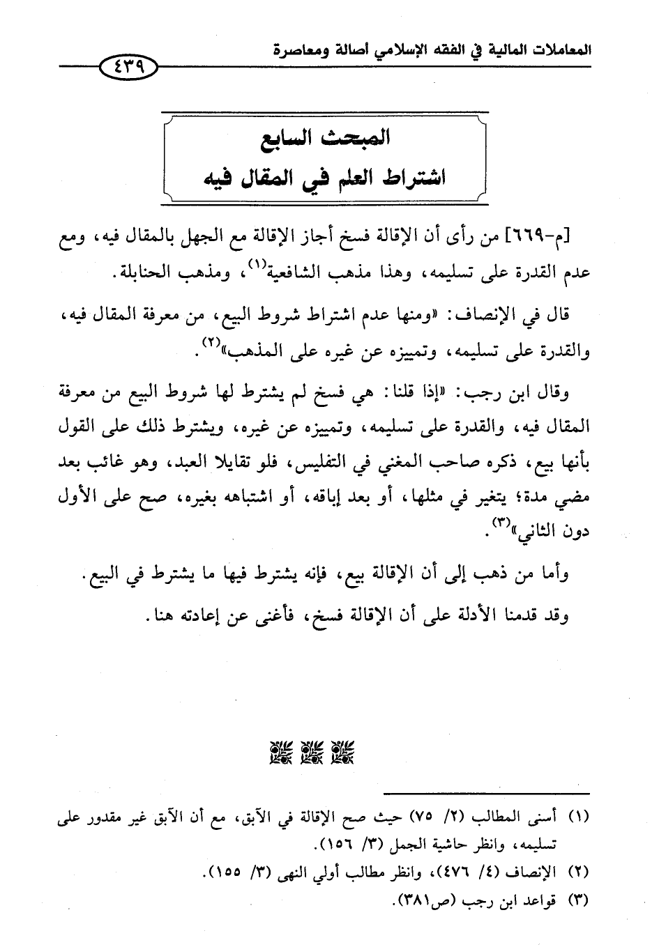 [م - ٦٦٩] من رأى أن الإقالة فسخ أجاز الإقالة مع الجهل بالمقال فيه، ومع عدم القدرة على تسليمه، وهذا مذهب الشافعية (¬١)، ومذهب الحنابلة.