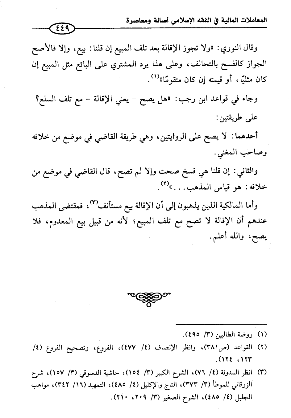 وجاء في قواعد ابن رجب: "هل يصح -يعني الإقالة- مع تلف السلع؟