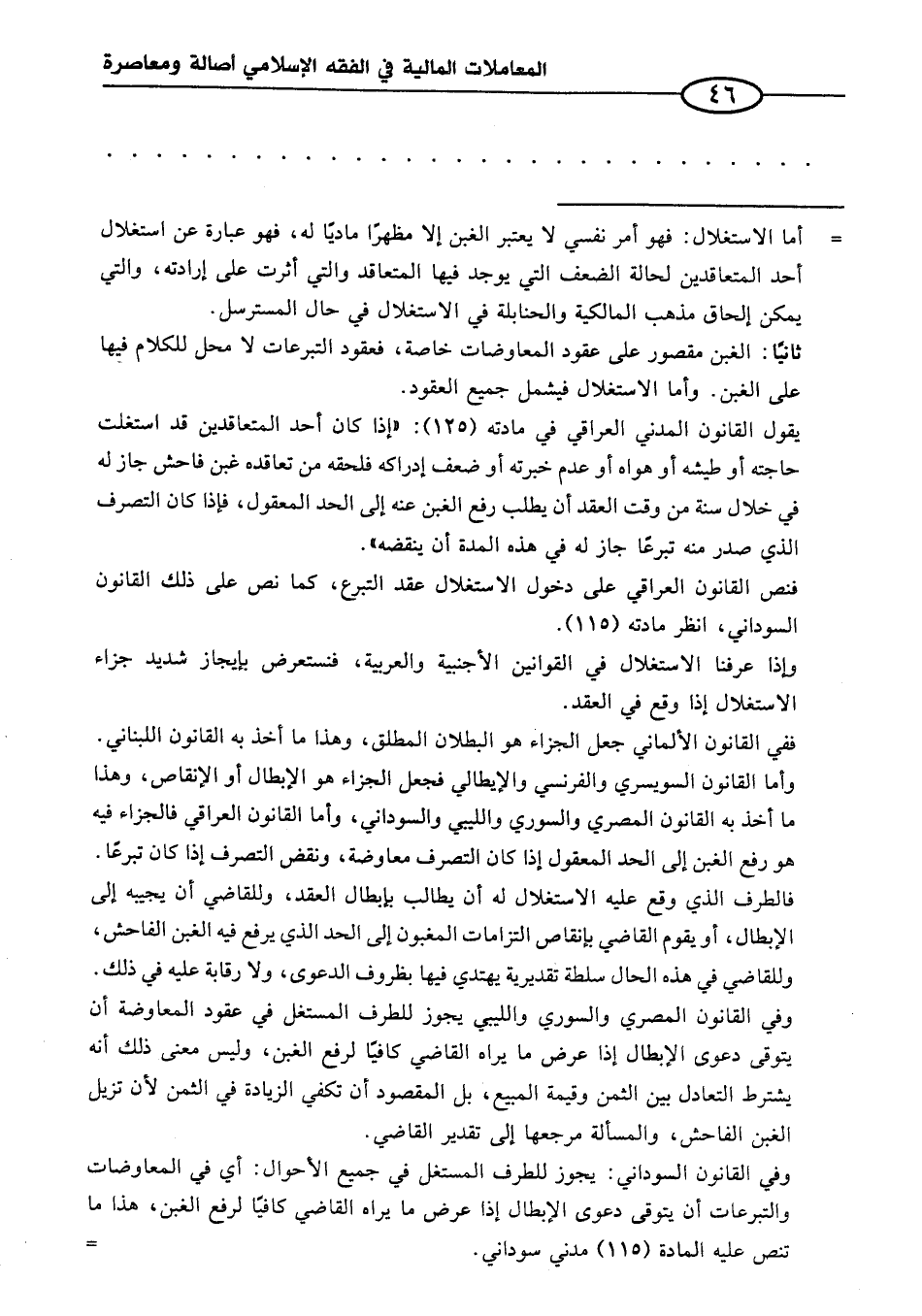 يقول القانون المدني العراقي في مادته (١٢٥): "إذا كان أحد المتعاقدين قد استغلت حاجته أو طيشه أو هواه أو عدم خبرته أو ضعف إدراكه فلحقه من تعاقده غبن فاحش جاز له في خلال سنة من وقت العقد أن يطلب رفع الغبن عنه إلى الحد المعقول، فإذا كان التصرف الذي صدر منه تبرعًا جاز له في هذه المدة أن ينقضه".