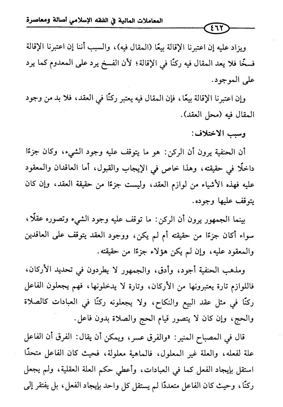 بينما الجمهور يرون أن الركن: ما توقف عليه وجود الشيء وتصوره عقلًا، سواء أكان جزءًا من حقيقته أم لم يكن، ووجود العقد يتوقف على العاقدين والمعقود عليه، وإن لم يكن هؤلاء جزءًا من حقيقته.