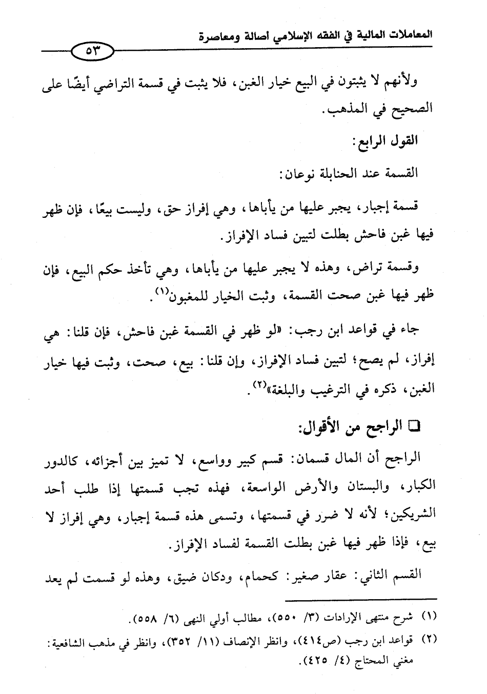 الراجح أن المال قسمان: قسم كبير وواسع، لا يتميز بين أجزائه، كالدور الكبار، والبستان والأرض الواسعة، فهذه تجب قسمتها إذا طلب أحد الشريكين؛ لأنه لا ضرر في قسمتها، وتسمى هذه قسمة إجبار، وهي إفراز لا بيع، فإذا ظهر فيها غبن بطلت القسمة لفساد الإفراز.
