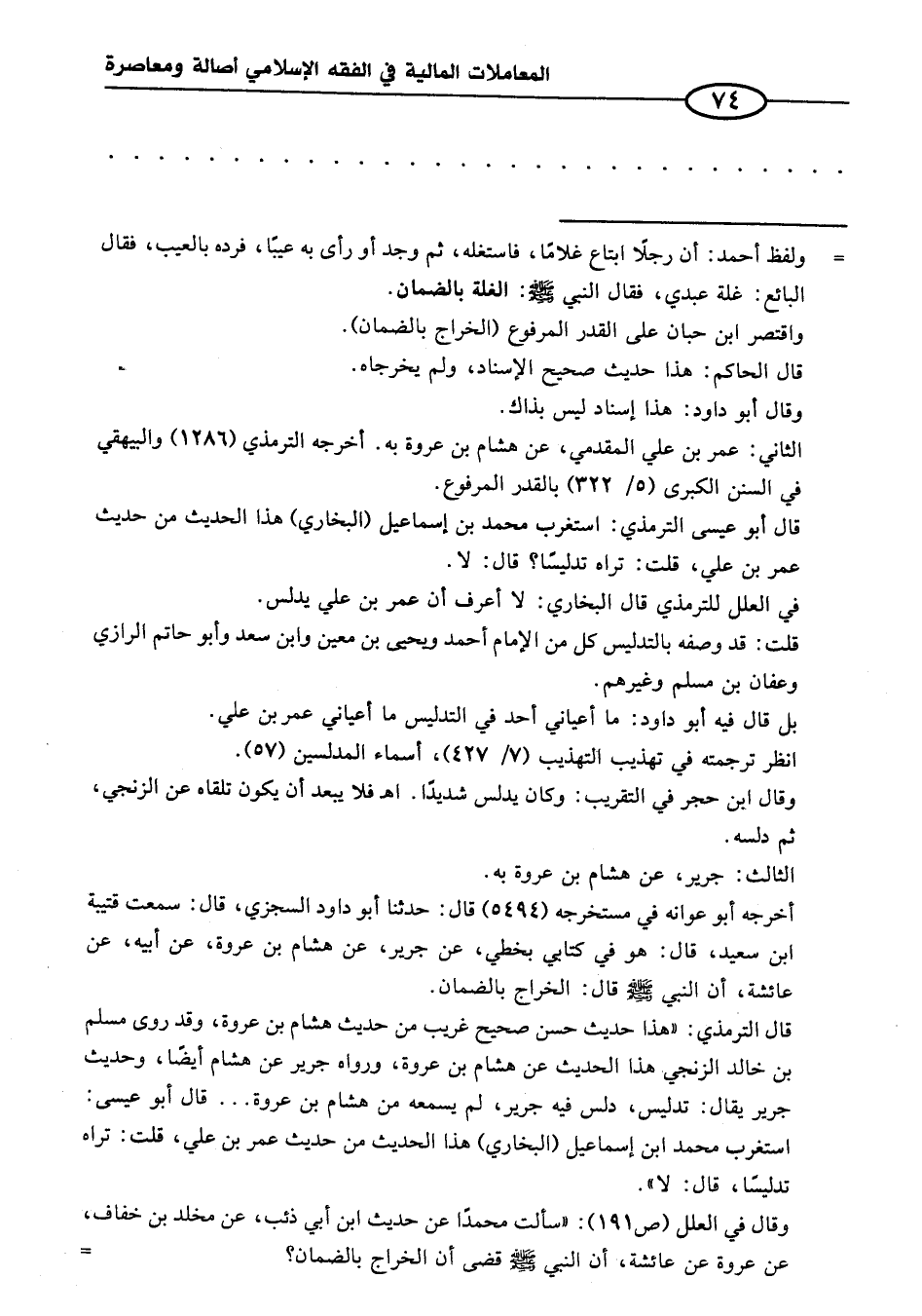 وقال في العلل (ص ١٩١): "سألت محمدًا عن حديث ابن أبي ذئب، عن مخلد بن خفاف، عن عروة عن عائشة، أن النبي - صلى الله عليه وسلم - قضى أن الخراج بالضمان؟ =