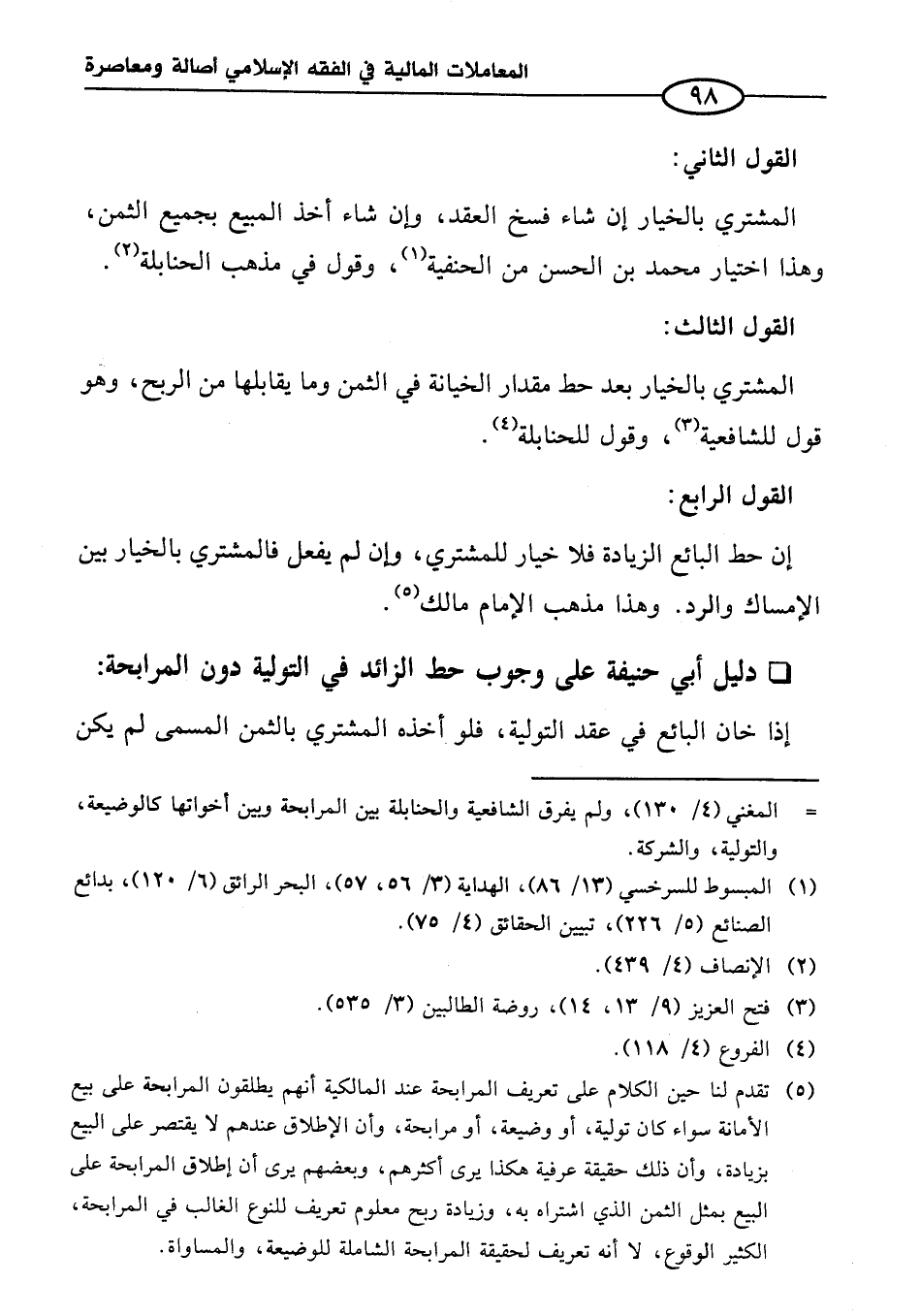 (¬٥) تقدم لنا حين الكلام على تعريف المرابحة عند المالكية أنهم يطلقون المرابحة على بيع الأمانة سواء كان تولية، أو وضيعة، أو مرابحة، وأن الإطلاق عندهم لا يقتصر على البيع بزيادة، وأن ذلك حقيقة عرفية هكذا يرى أكثرهم، وبعضهم يرى أن إطلاق المرابحة على البيع بمثل الثمن الذي اشتراه به، وزيادة ربح معلوم تعريف للنوع الغالب في المرابحة، الكثير الوقوع، لا أنه تعريف لحقيقة المرابحة الشاملة للوضيعة، والمساواة.