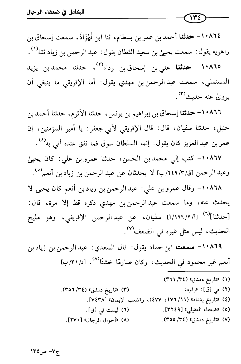10865 - حَدثنا علي بن إسحاق بن رداء، حَدثنا مُحمد بن يزيد المستملي، سمعت عَبد الرحمن بن مهدي يقول: أما الإفريقي ما ينبغي أن يروي عنه حديث.