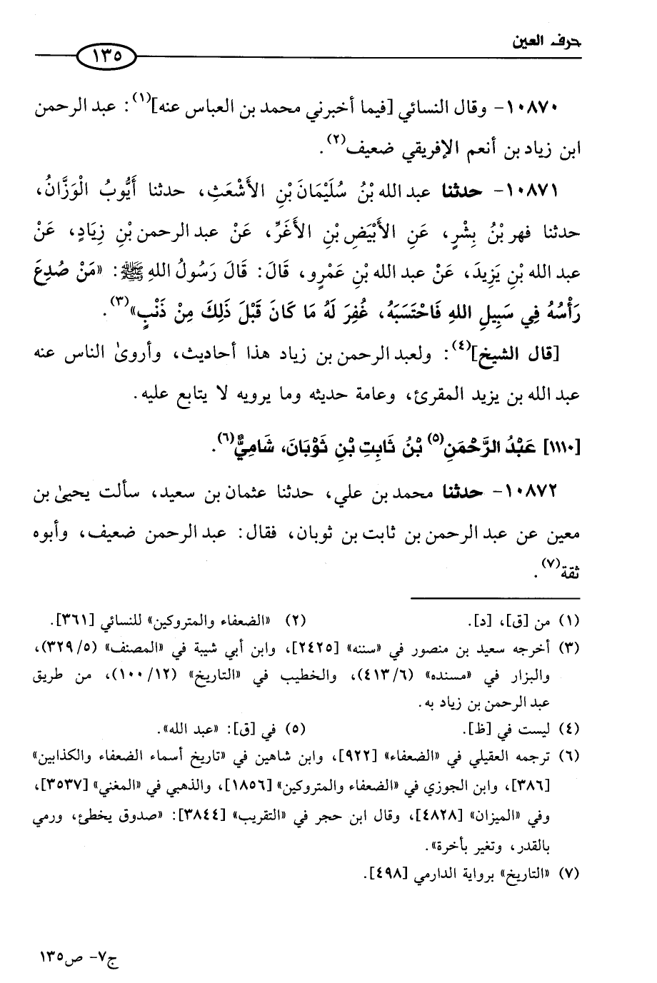 10870 - وقال النسائي، فيما أخبرني محمد بن العباس، عنه: عَبد الرحمن بن زياد بن أنعم الإفريقي ضعيف.