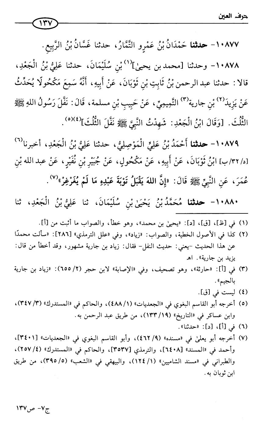10878 - وحَدَّثنا مُحمد بن يحيي بن سليمان، حَدثنا علي بن الجعد، قالا: حَدثنا عَبد الرحمن بن ثابت بن ثوبان، عن أبيه، أنه سمع مكحولا يحدث عن يزيد (1) بن جارية التميمي، عن حبيب بن مسلمة، قال: نفَّل رسول الله صَلي الله عَليه وسَلم الثلث. وقال ابن الجعد: شهدت النبي صَلي الله عَليه وسلم نفَّل الثلث.