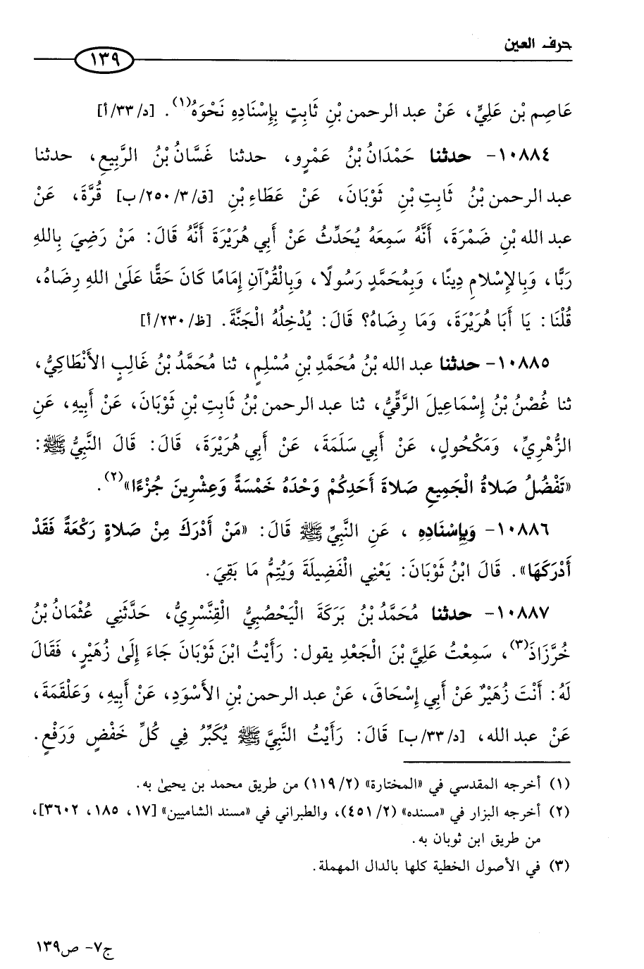 10887 - حَدثنا مُحمد بن بركة اليحصبي القِنَّسْري، حَدَّثني عثمان بن خرزاذ، سمعت علي بن الجعد يقول: رأيت ابن ثوبان جاء إلي زهير، فقال له: أنت زهير عن أبي إسحاق، عن عَبد الرحمن بن الأسود، عن أبيه، وعلقمة، عن عَبد الله، قال: رأيتُ النبي صَلي الله عَليه وسلم يكبر في كل خفض ورفع؟ فقال زهير: نعم أنا هو.