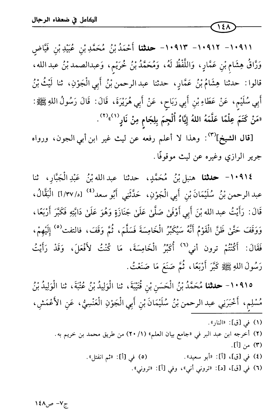 10911 - 10912 - 10913 - حَدثنا أحمد بن مُحمد بن عُبيد بن فياض وراق هشام بن عمار، واللفظ له، ومُحمد بن خريم، وعَبد الصمد بن عَبد الله، قالوا: حَدثنا هشام بن عمار، حَدثنا عَبد الرحمن بن أبي الجون، حَدثنا لَيث بن أَبي سُلَيم، عن عطاء بن أبي رباح، عن أبي هريرة، قال: قال رسول الله صَلي الله عَليه وسَلم: من كتم علما علمه الله إياه، أُلْجِم بلجام من نار.