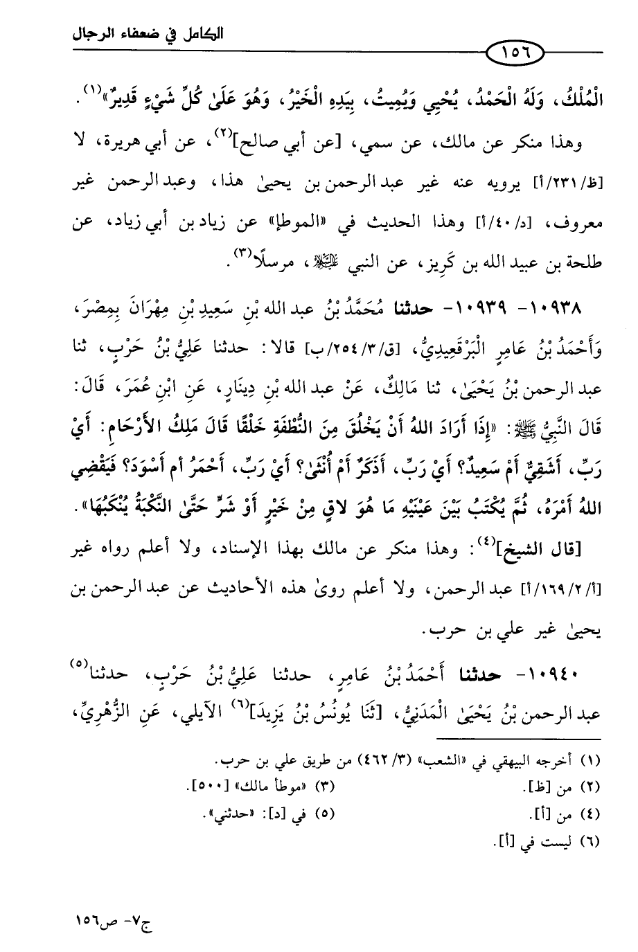 10938 - 10939 - حَدثنا مُحمد بن عَبد الله بن سعيد بن مهران بمصر، وأحمد بن عامر البرقعيدي، قالا: حَدثنا علي بن حرب، حَدثنا عَبد الرحمن بن يَحيي، حَدثنا مالك، عن عَبد الله بن دينار، عن ابن عُمر، قال: قال النبي صَلي الله عَليه وسلم: إذا أراد الله أن يخلق من النطفة خلقا، قال ملك الأرحام: أي رب أشقي أم سعيد؟ أي رب، أذكر أم أنثي؟ أي رب، أحمر أم أسود؟ فيقضي الله أمره ثم يكتب بين عينيه ما هو لاق من خير أو شر حتي النكبة ينكبها.