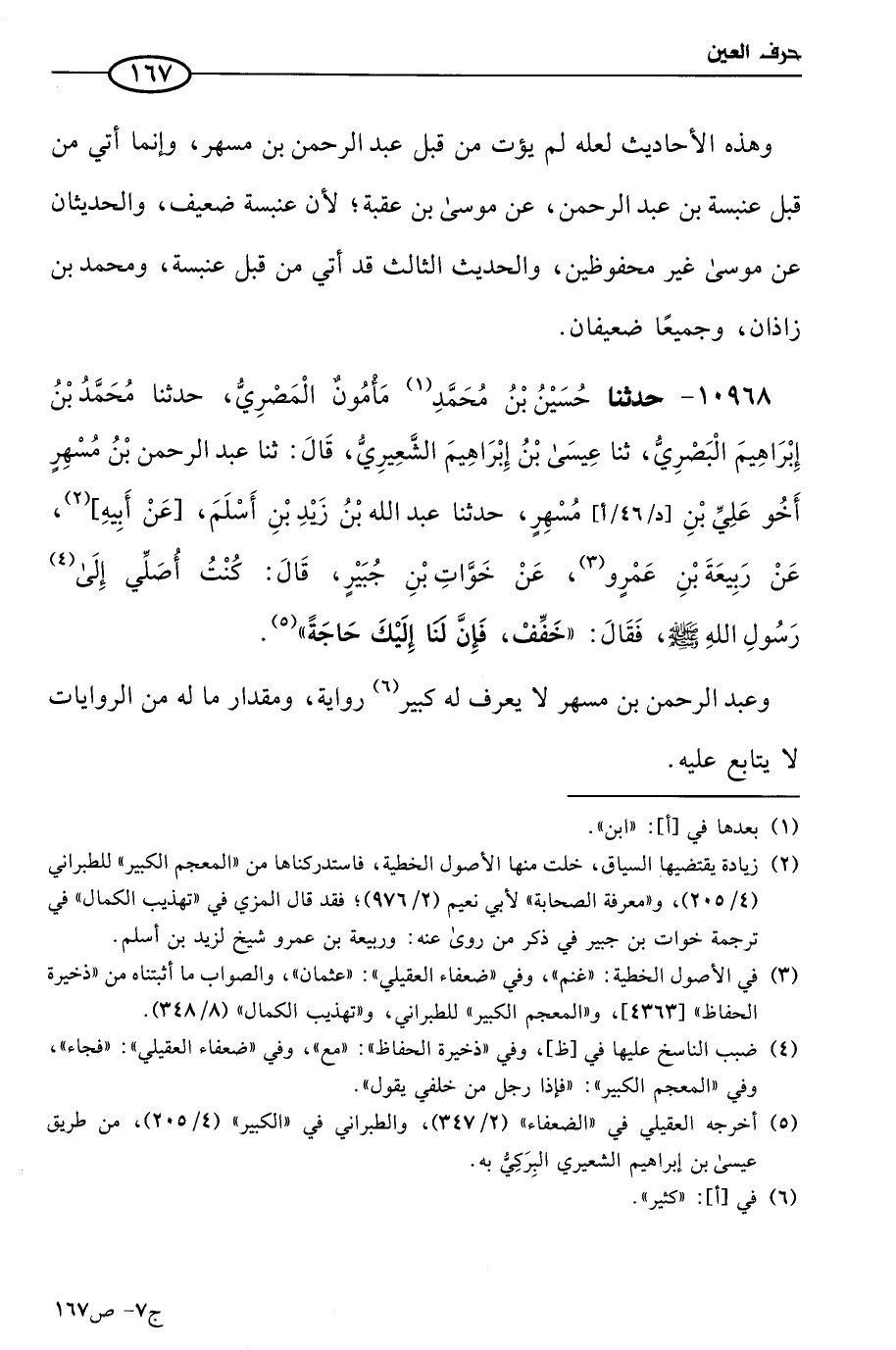 10968 - حَدثنا حسين بن مُحمد مأمون المصري، حَدثنا مُحمد بن إبراهيم البصري، حَدثنا عيسي بن إبراهيم الشعيري، قال: حَدثنا عَبد الرحمن بن مسهر أخو علي بن مسهر، حَدثنا عَبد الله بن زيد بن أسلم، عن أبيه، عن ربيعة بن عمرو، عن خوات بن جبير قال: كنتُ أصلي إلي (1) رسول الله صَلي الله عَليه وسَلم، فقال: خفف فإن لنا إليك حاجة.