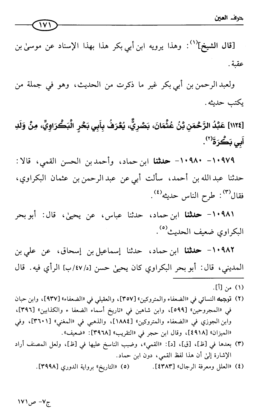 10979 - 10980 - حَدثنا ابن حماد، وأحمد بن الحسن القمي، قالا: حَدثنا عَبد الله بن أحمد، سألت أبي، عن عَبد الرحمن بن عثمان البكراوي، فقال: طرح الناس حديثه.